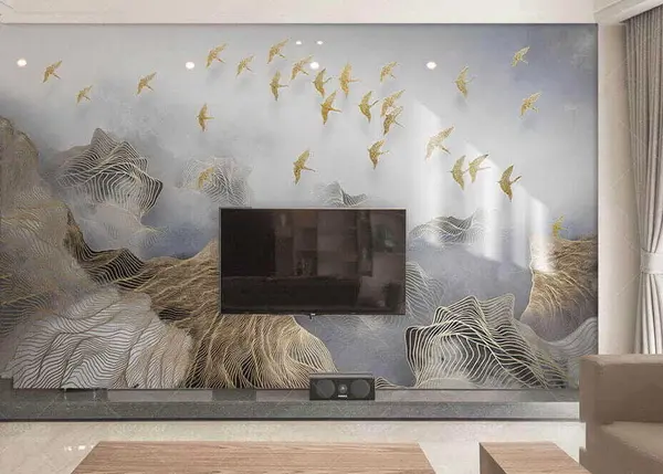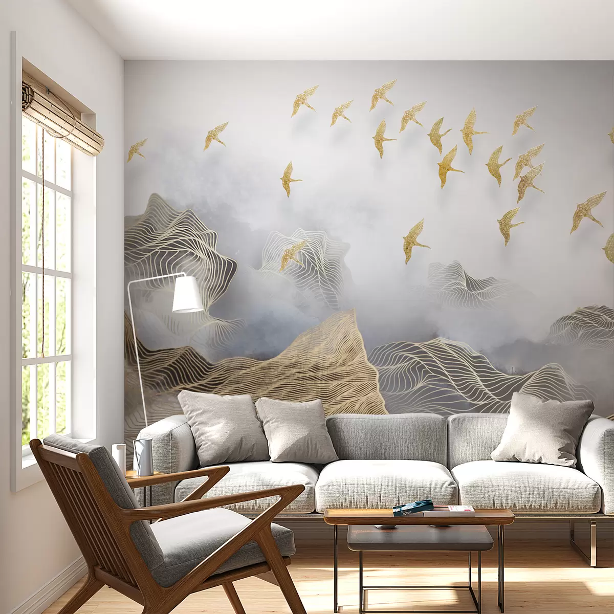Шпалери З тонких ліній вимальовується чудовий пейзаж з горами і птахами u44870