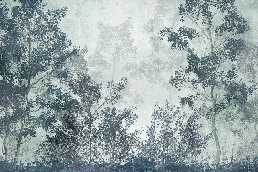 Туманний пейзаж з високими деревами та горами в приглушених зелених і сірих тонах, мінімалістичний стиль, текстурований