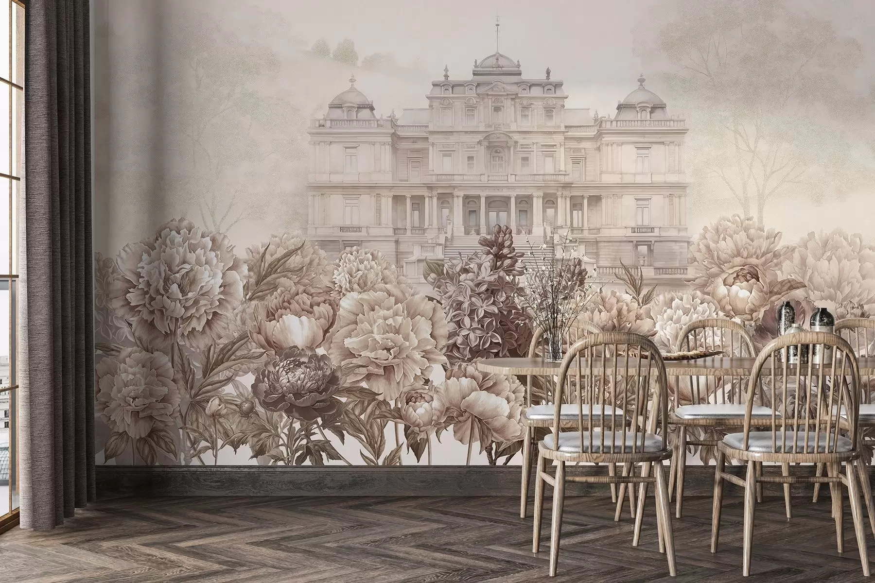 Королівський палац з півонієвим садом, акварельний стиль, природа, бежеві кольори, бохо
