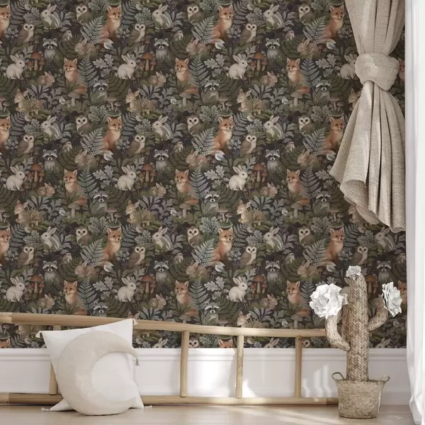 Шпалери Лісові тварини та папороті на глибокому вугільному тлі a00880
