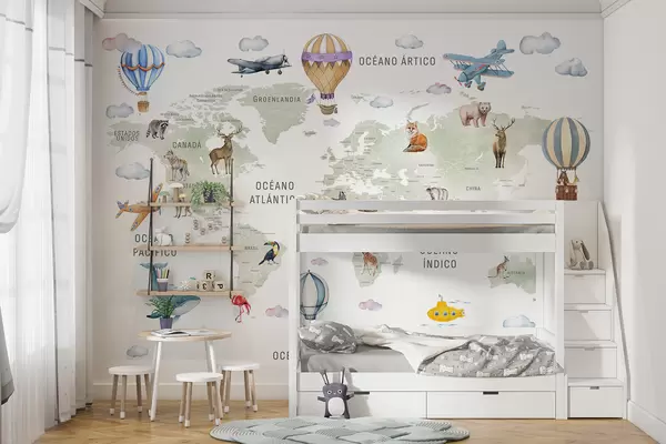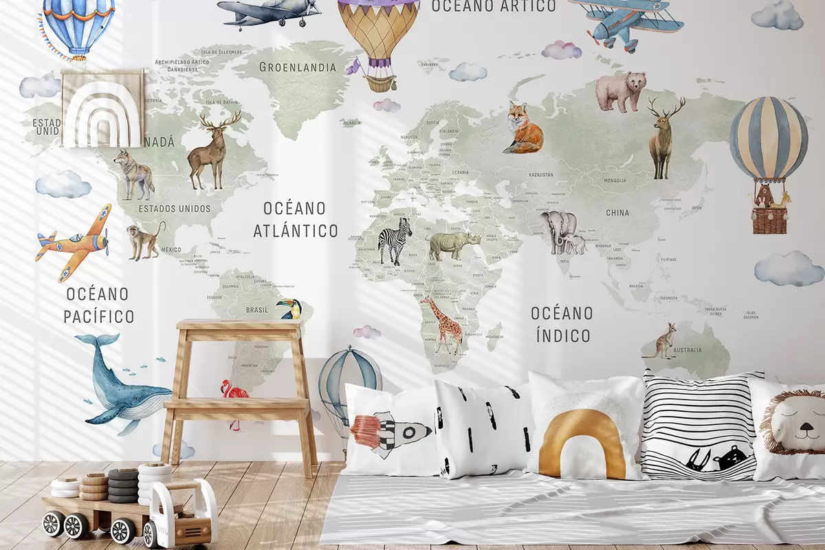 Фотошпалери Дитяча карта в стилі акварелі з тваринами та повітряними кулями. Іспанська мова. Зелений колір. c00001es