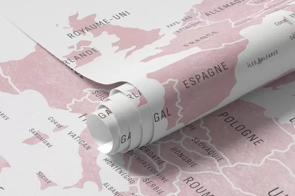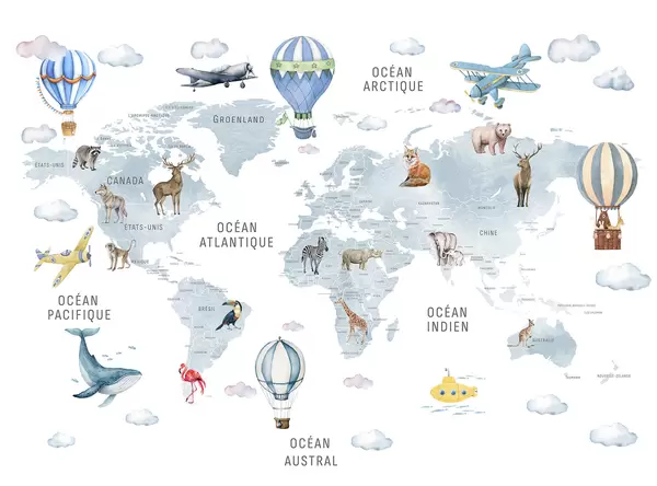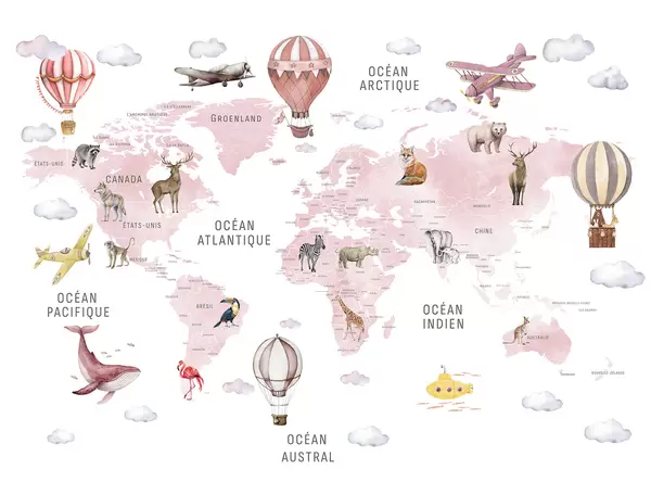 Фотошпалери Дитяча карта в акварельному стилі з тваринами та повітряними кулями. Французька мова. Рожевий колір. c00001frv3