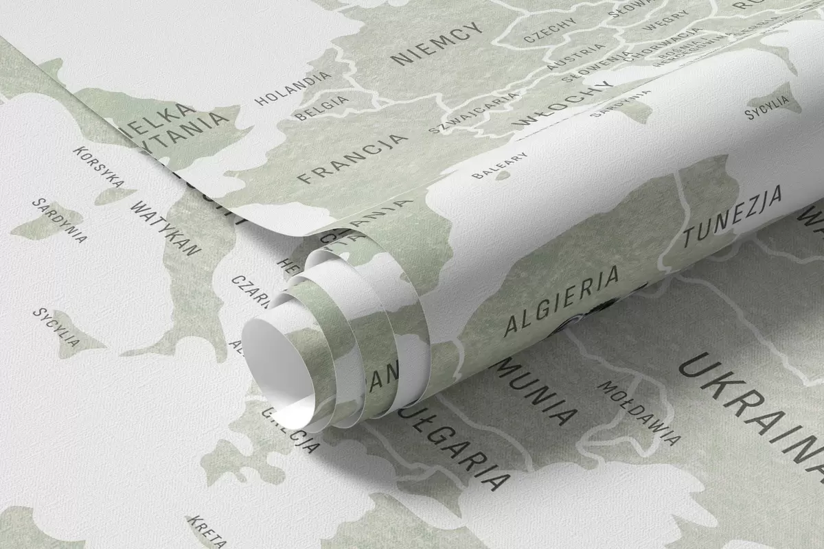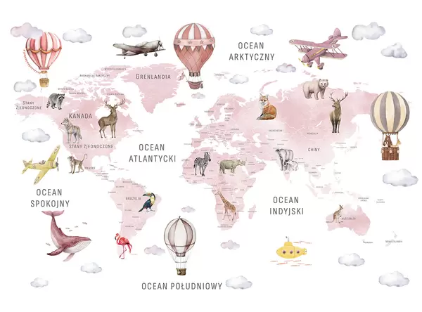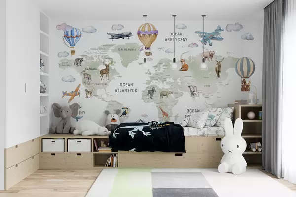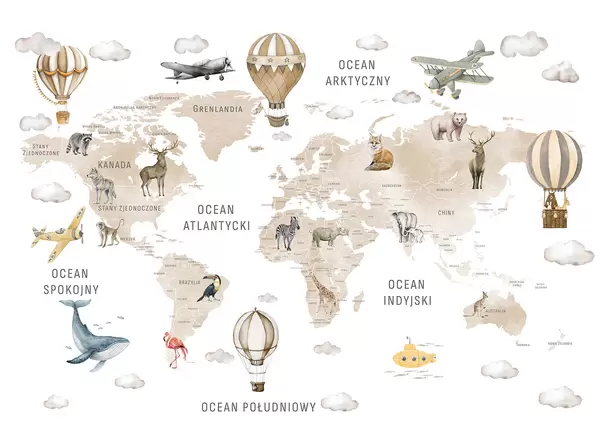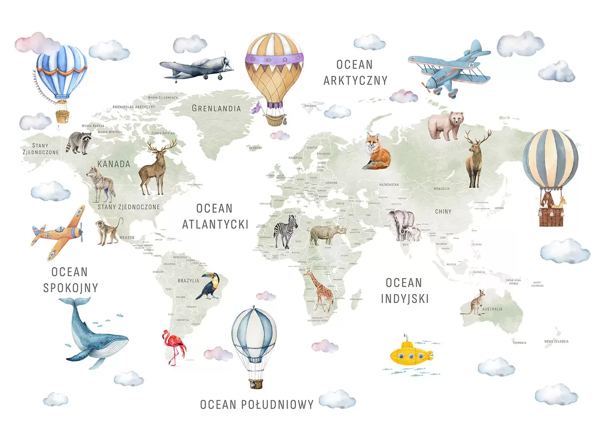 Фотошпалери Дитяча карта в стилі акварелі з тваринами та повітряними кулями. Польська мова. Зелений колір. c00001pl