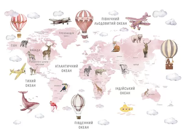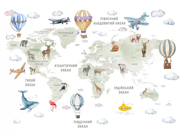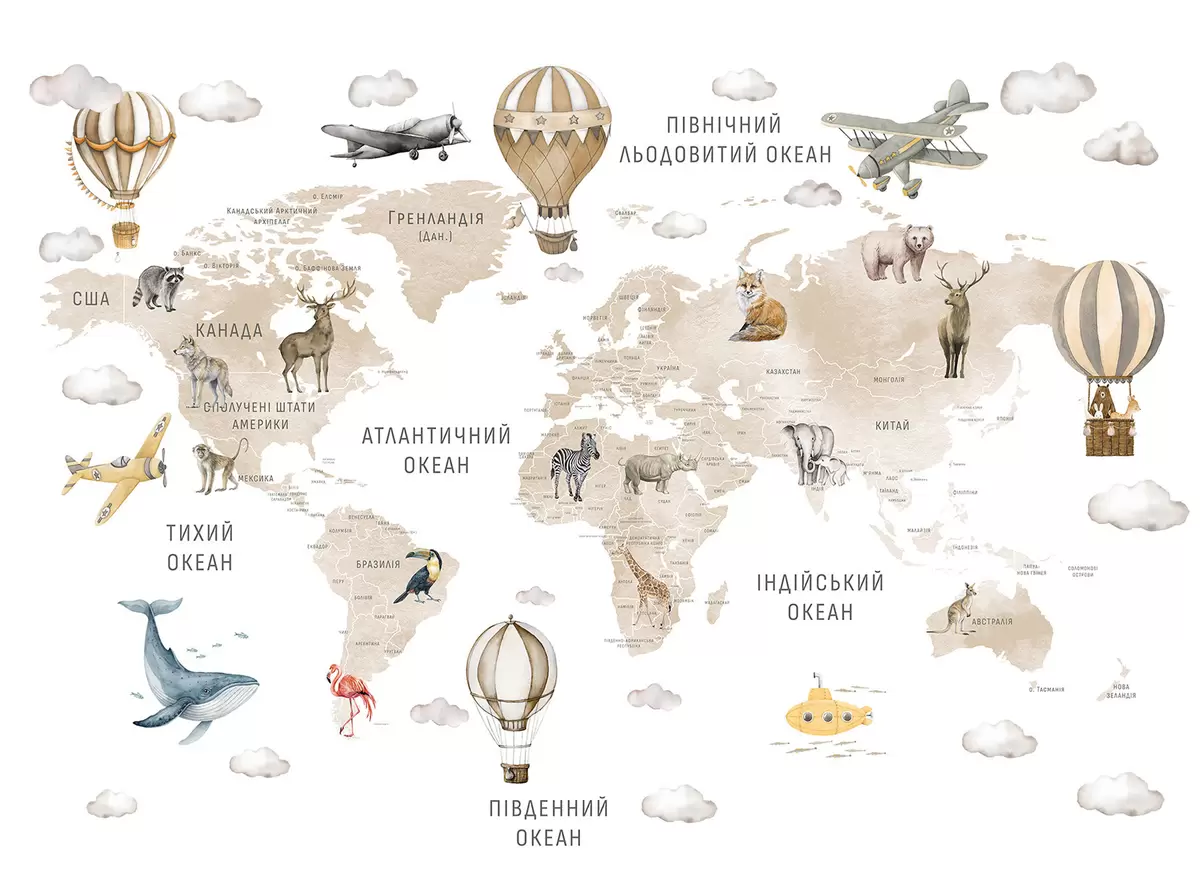 Фотошпалери Дитяча карта в стилі акварелі з тваринами та повітряними кулями. Українська мова. Бежевий колір. c00001ukv2