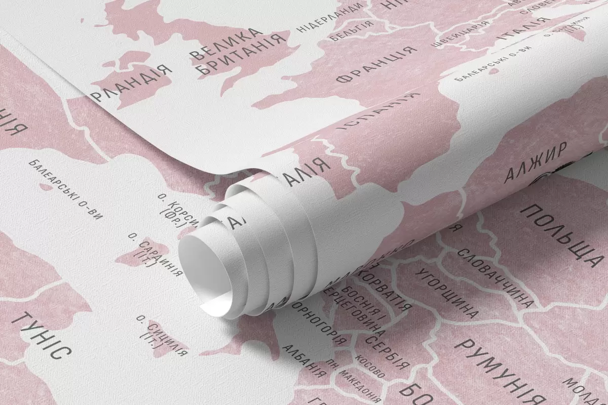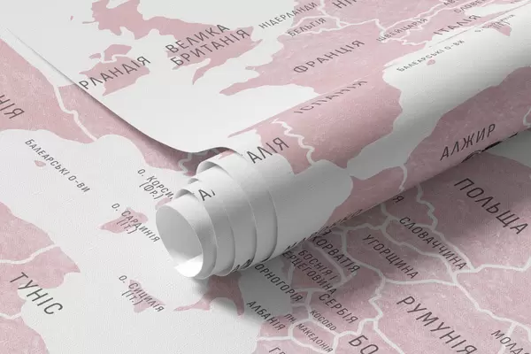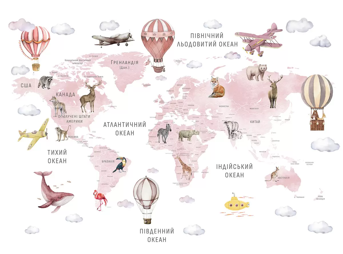 Фотошпалери Дитяча карта в стилі акварелі з тваринами та повітряними кулями. Українська мова. Рожевий колір. c00001ukv3
