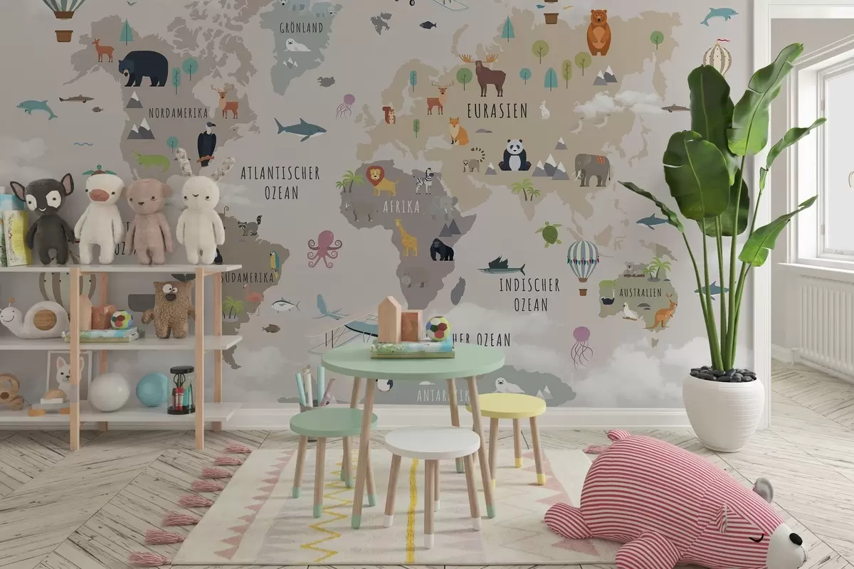 Фотошпалери Дитяча карта світу з тваринами та повітряними кулями. Німецька мова c00002de