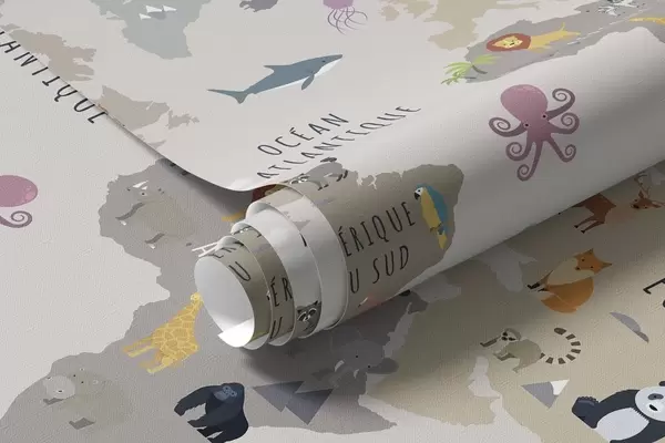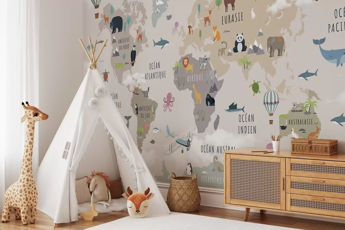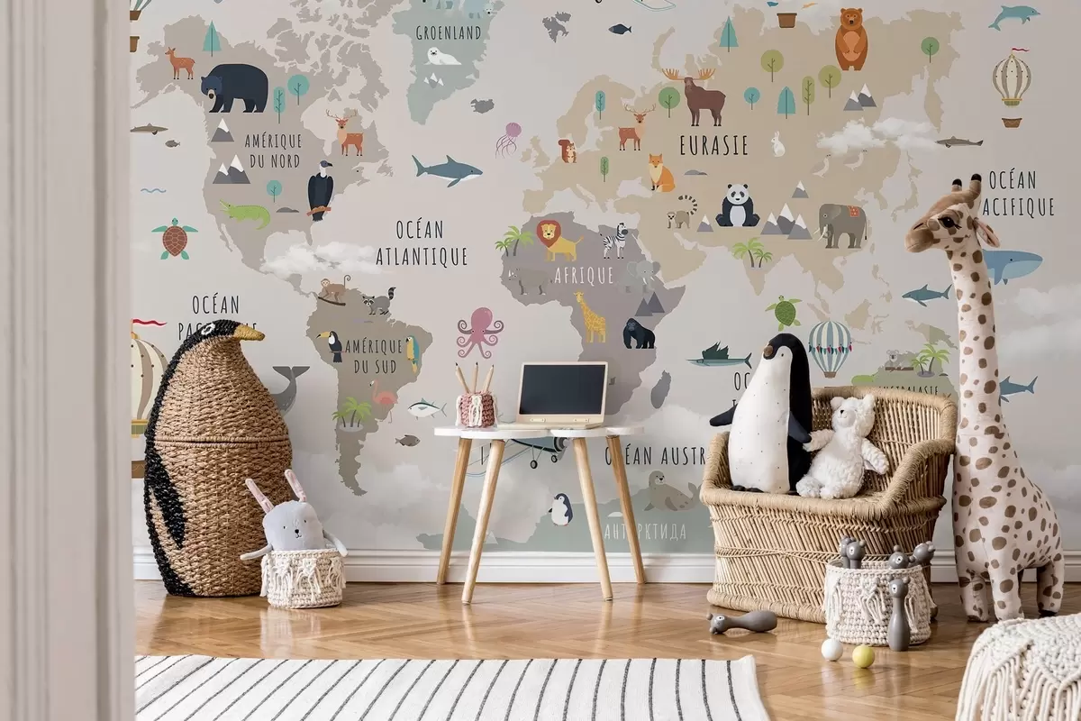 Фотошпалери Дитяча карта світу з тваринами та повітряними кулями. Французька мова c00002fr