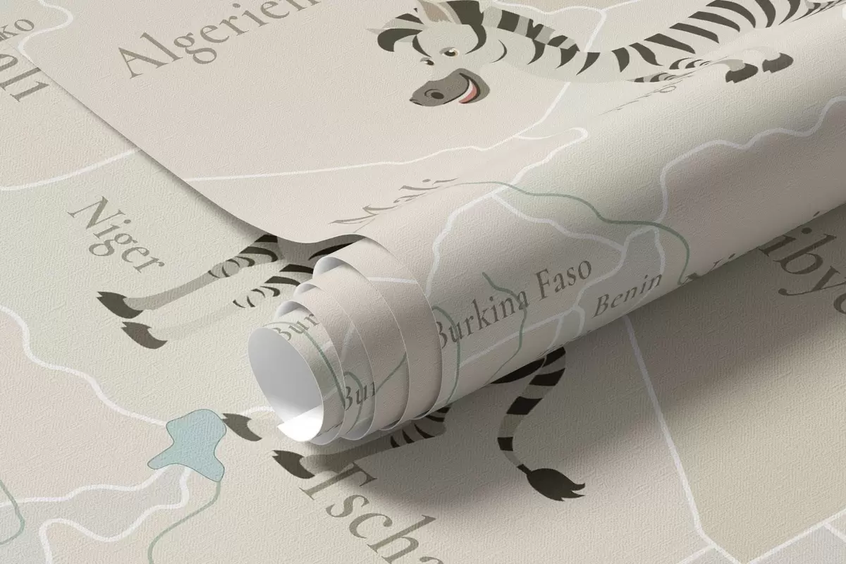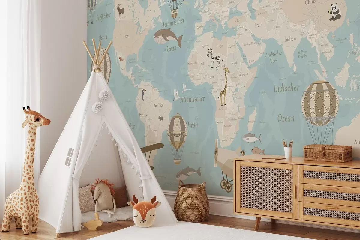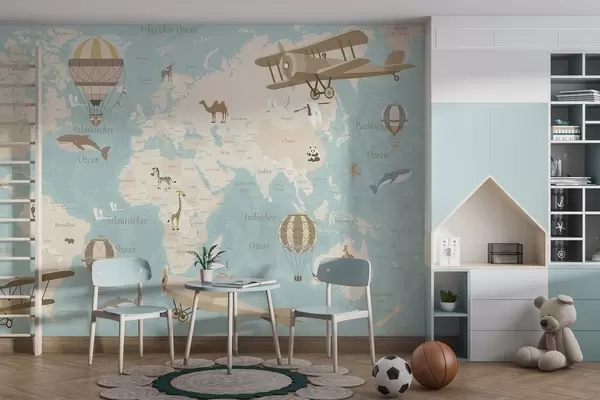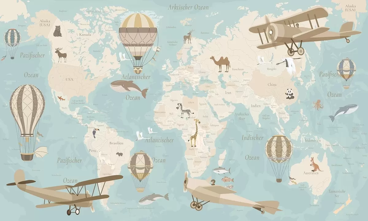 Фотошпалери Дитяча карта світу з тваринами, літаками та повітряними кулями. Німецька мова. Синій колір. c00003dev1