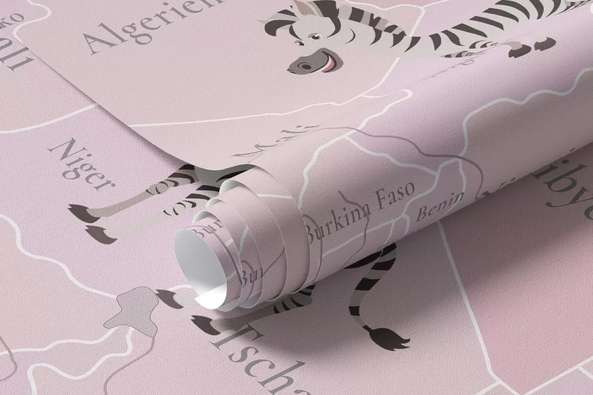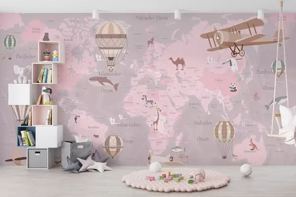 Фотошпалери Дитяча карта світу з тваринами, літаками та повітряними кулями. Німецька мова. Рожевий колір. c00003dev3
