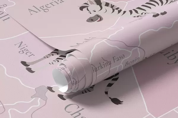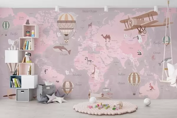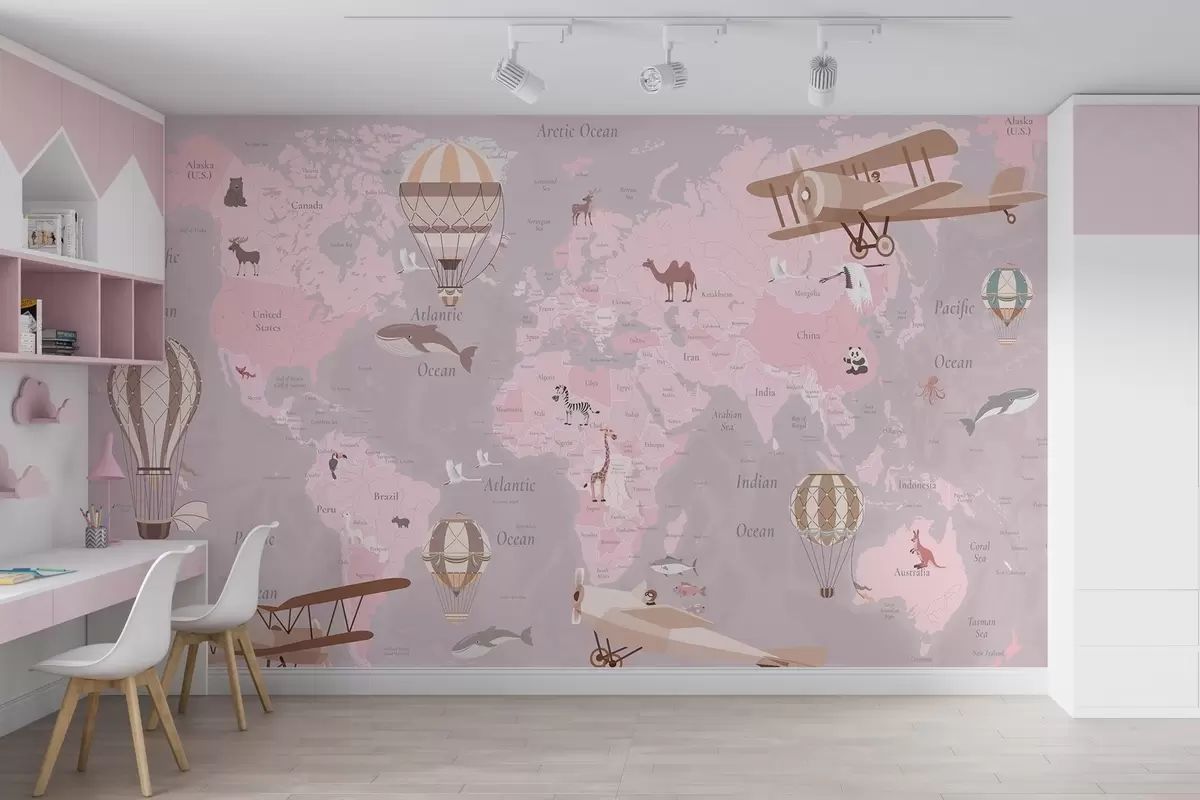 Фотошпалери Дитяча карта світу з тваринами, літаками та повітряними кулями. Англійська мова. Рожевий колір. c00003env3