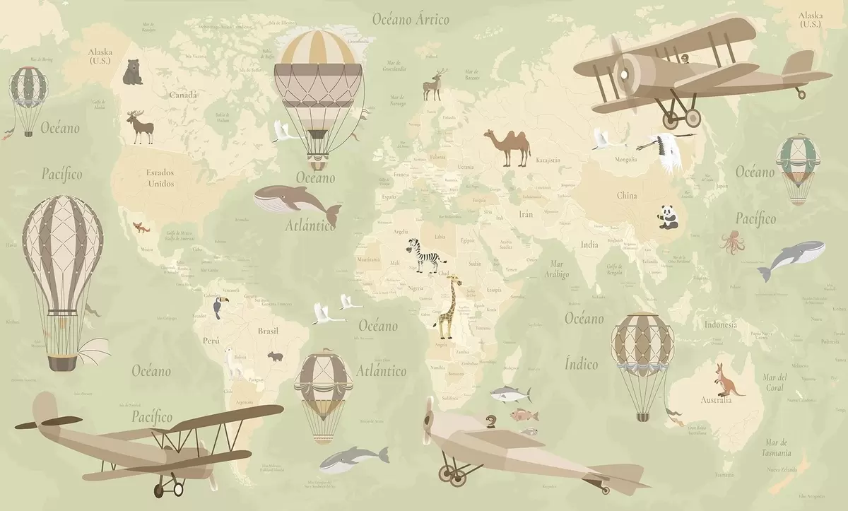 Фотошпалери Дитяча карта світу з тваринами, літаками та повітряними кулями. Іспанська мова. Зелений колір. c00003esv2