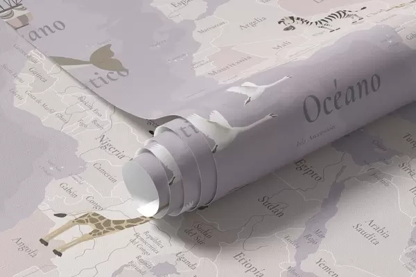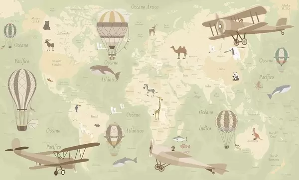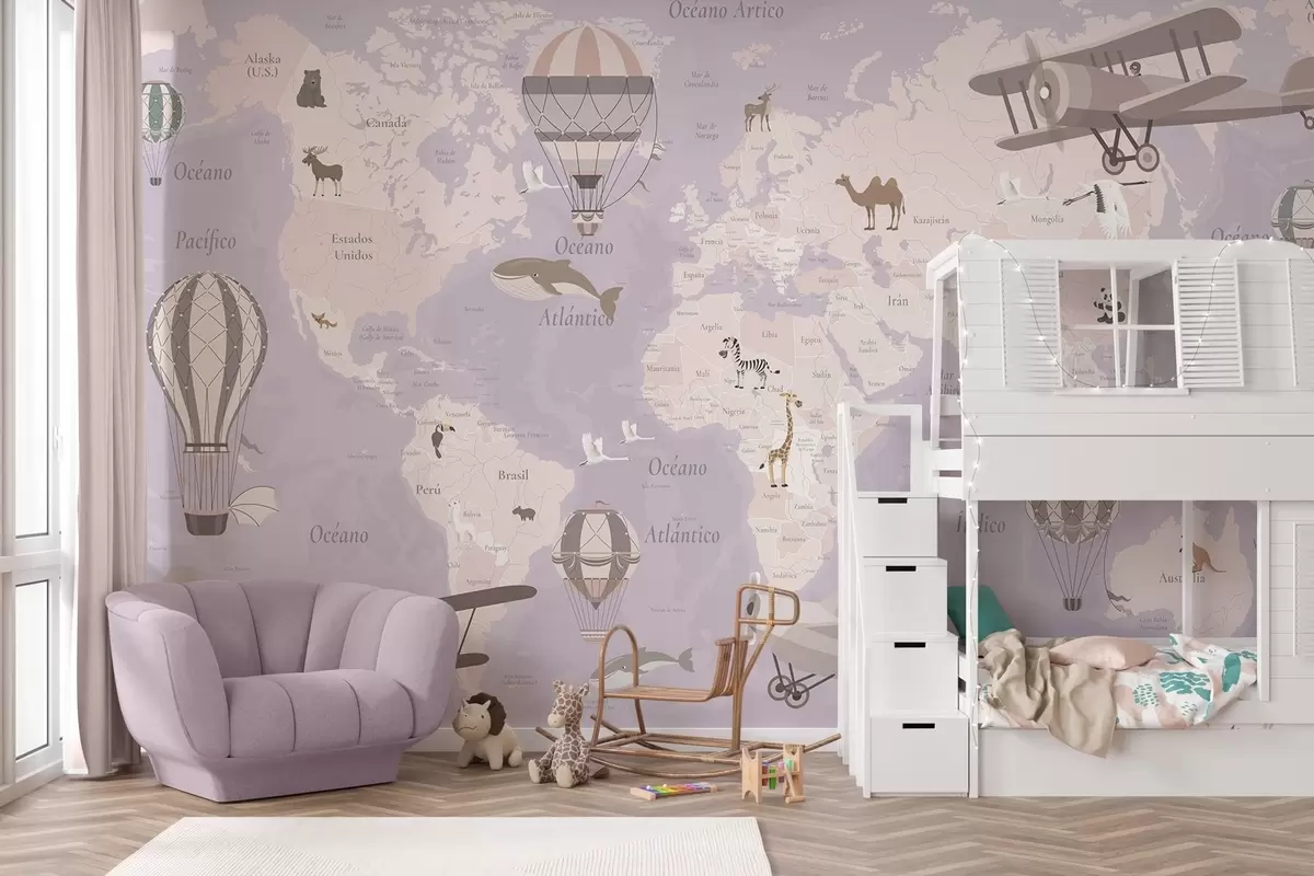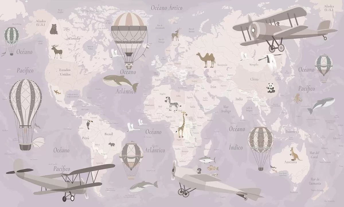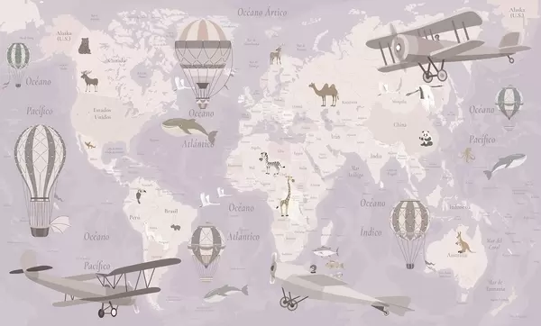Фотошпалери Дитяча карта світу з тваринами, літаками та повітряними кулями. Іспанська мова. Фіолетовий колір. c00003esv4