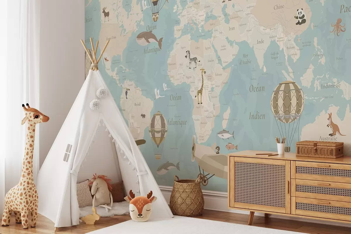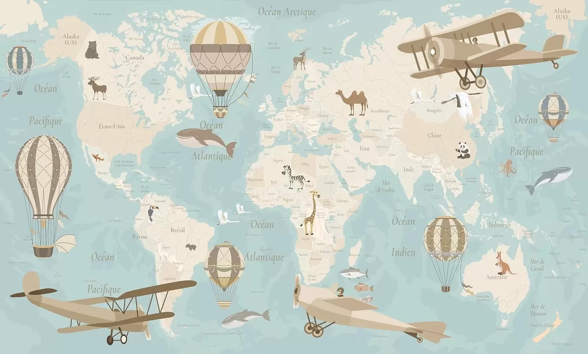 Фотошпалери Дитяча карта світу з тваринами, літаками та повітряними кулями. Французька мова. Синій колір. c00003frv1