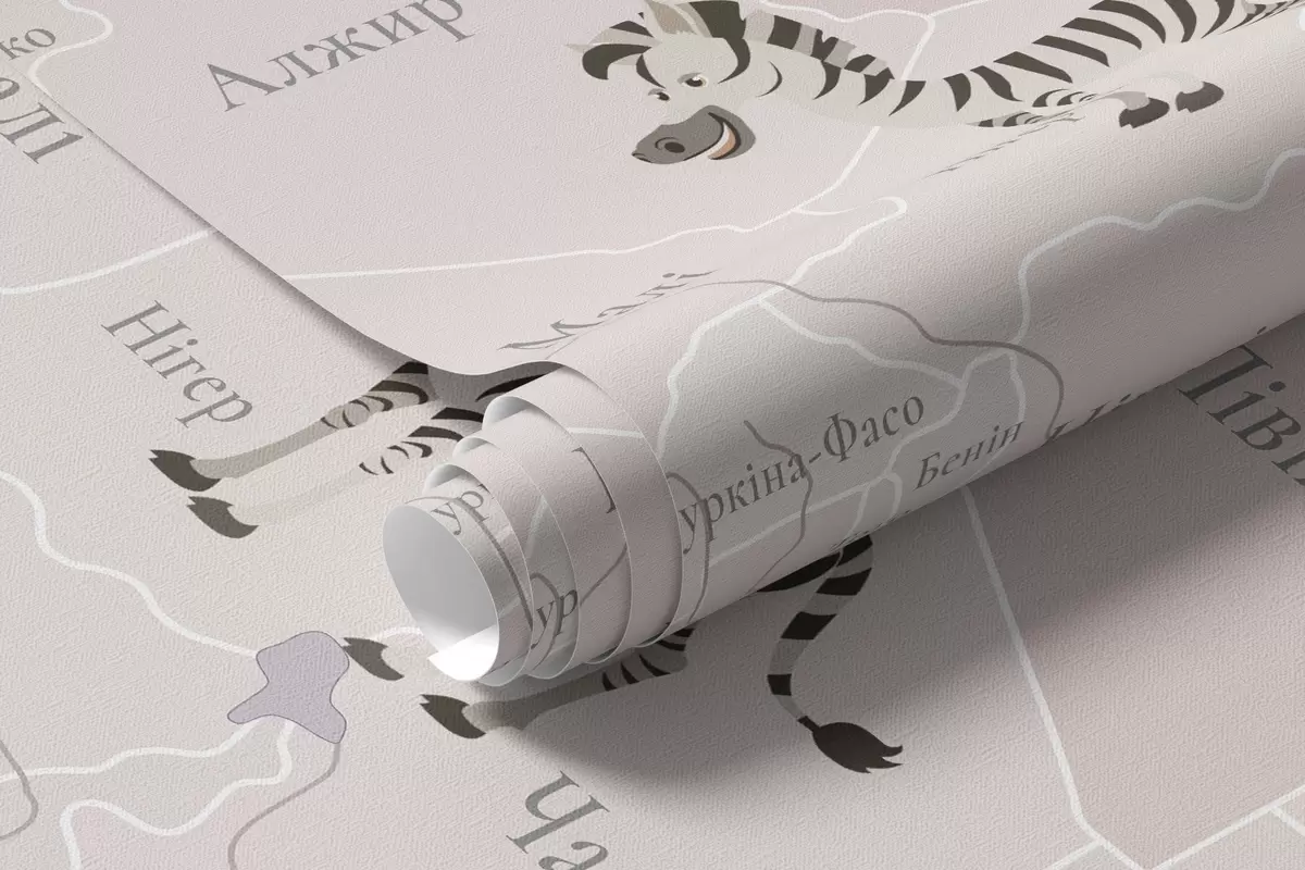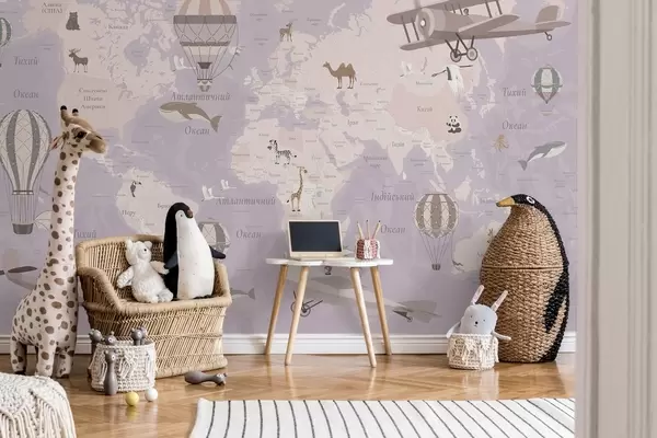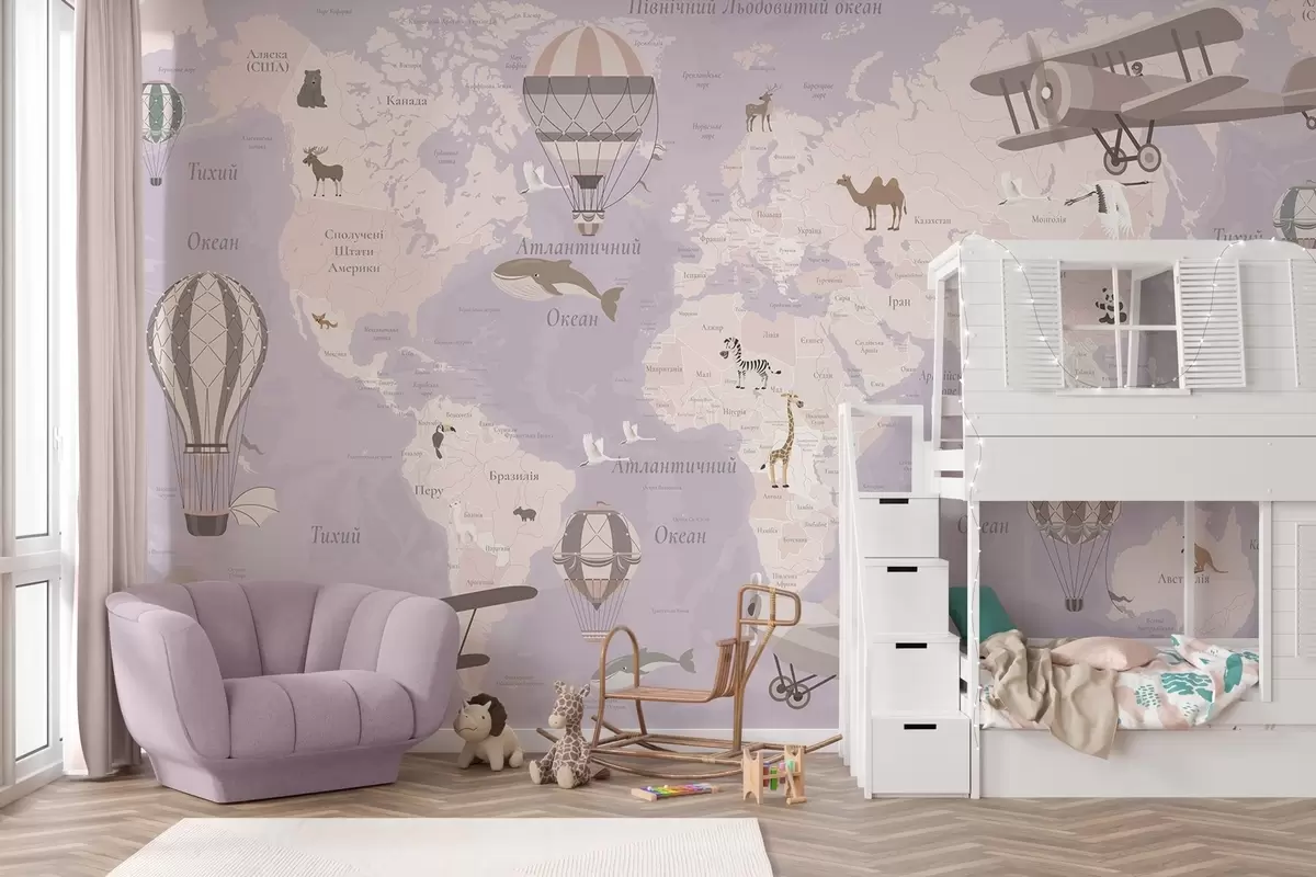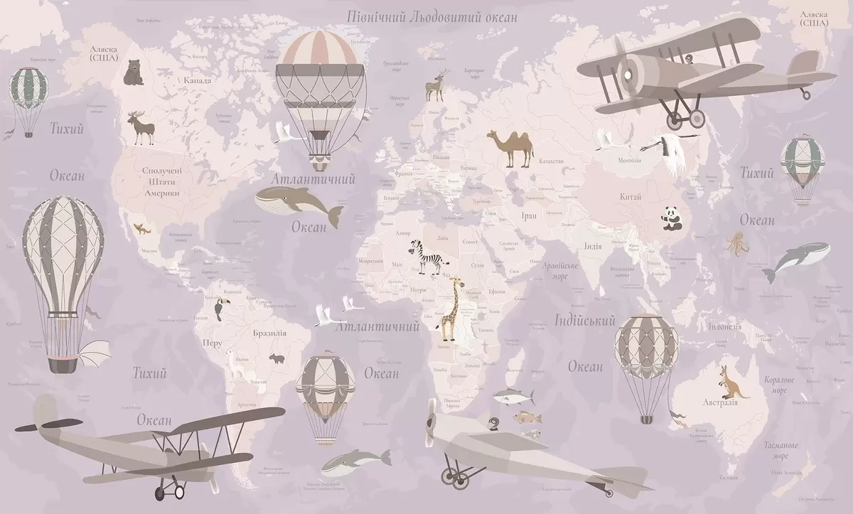 Фотошпалери Дитяча карта світу з тваринами, літаками та повітряними кулями. Українська мова. Фіолетовий колір c00003ukv4