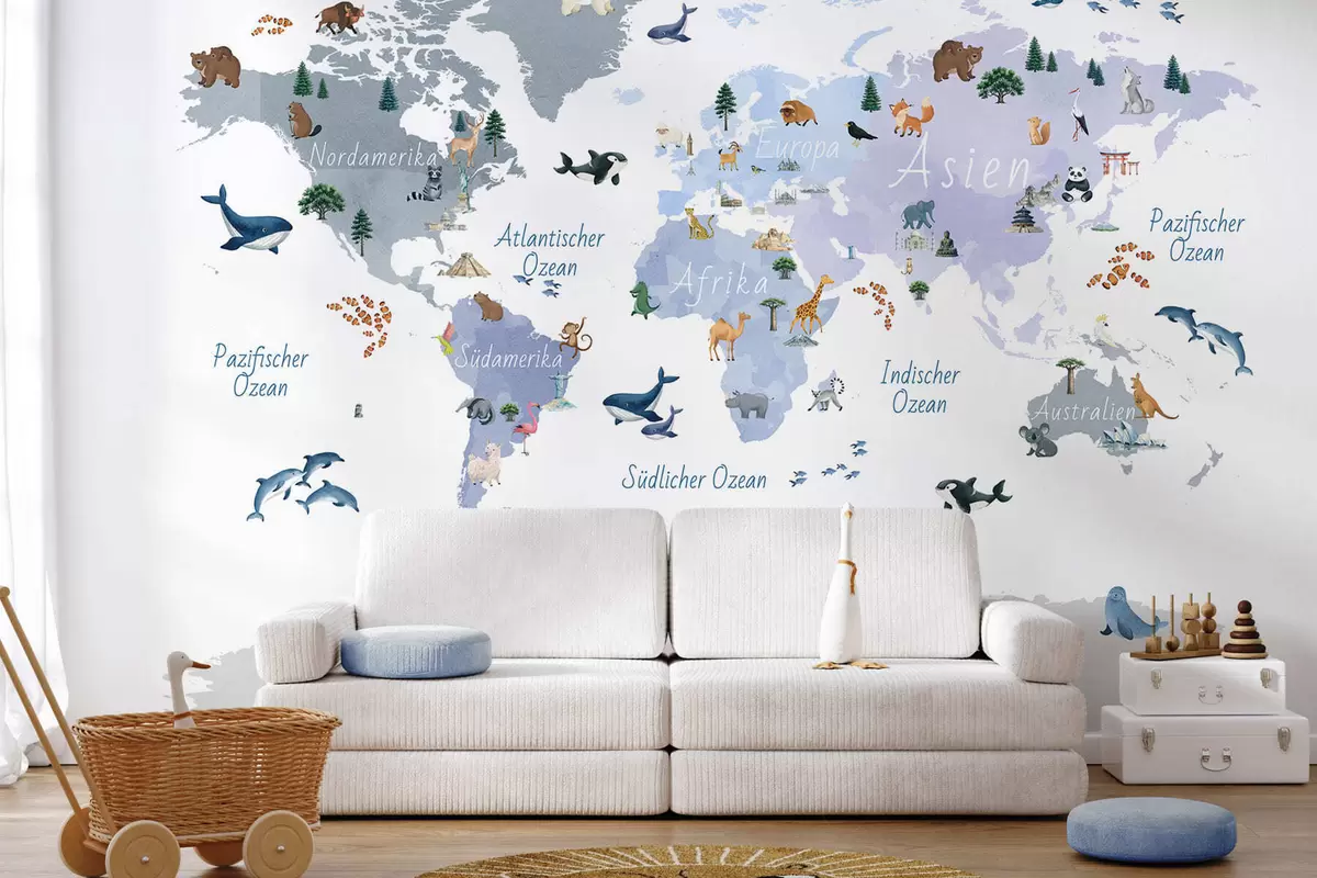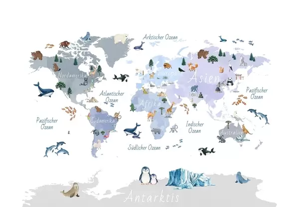 Фотошпалери Карта в стилі акварелі, на якій зображені тварини, рослини та архітектурні споруди. Написи німецькою мовою c00009dev1