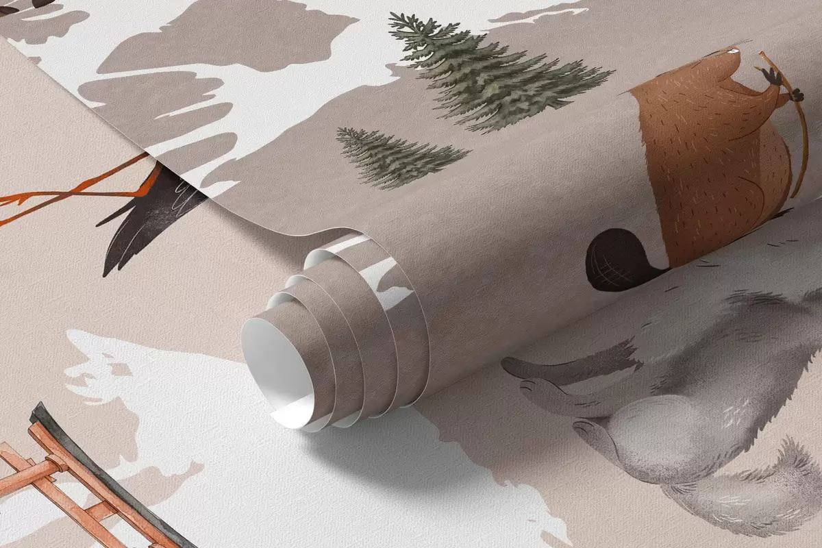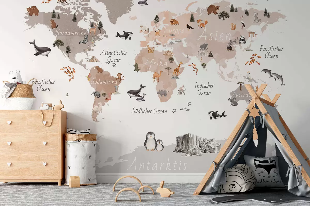 Фотошпалери Карта у стилі акварелі в бежевих тонах із зображеннями тварин, рослин та архітектурних споруд. Написи німецькою мовою c00009dev3