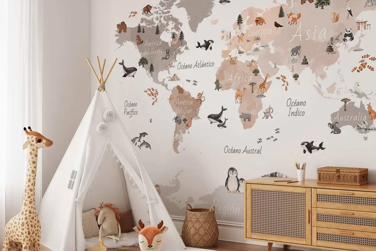 Фотошпалери Карта в бежевих тонах у стилі акварелі із зображеннями тварин, рослин та архітектурних споруд. Написи іспанською мовою c00009esv3