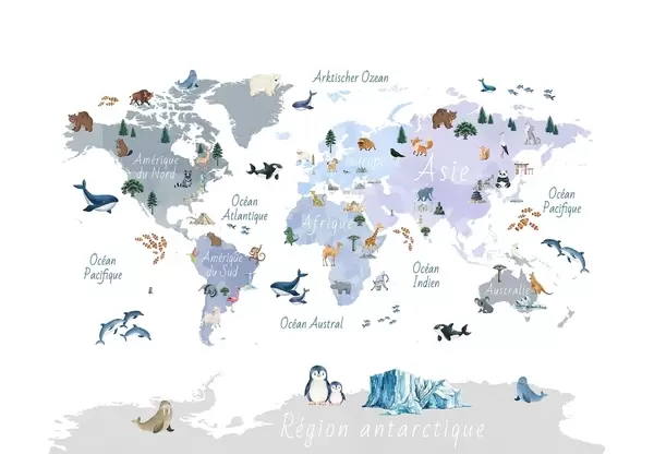Фотошпалери Кольорова карта у стилі акварелі із зображеннями тварин, рослин та архітектурних споруд. Написи французькою мовою c00009fr