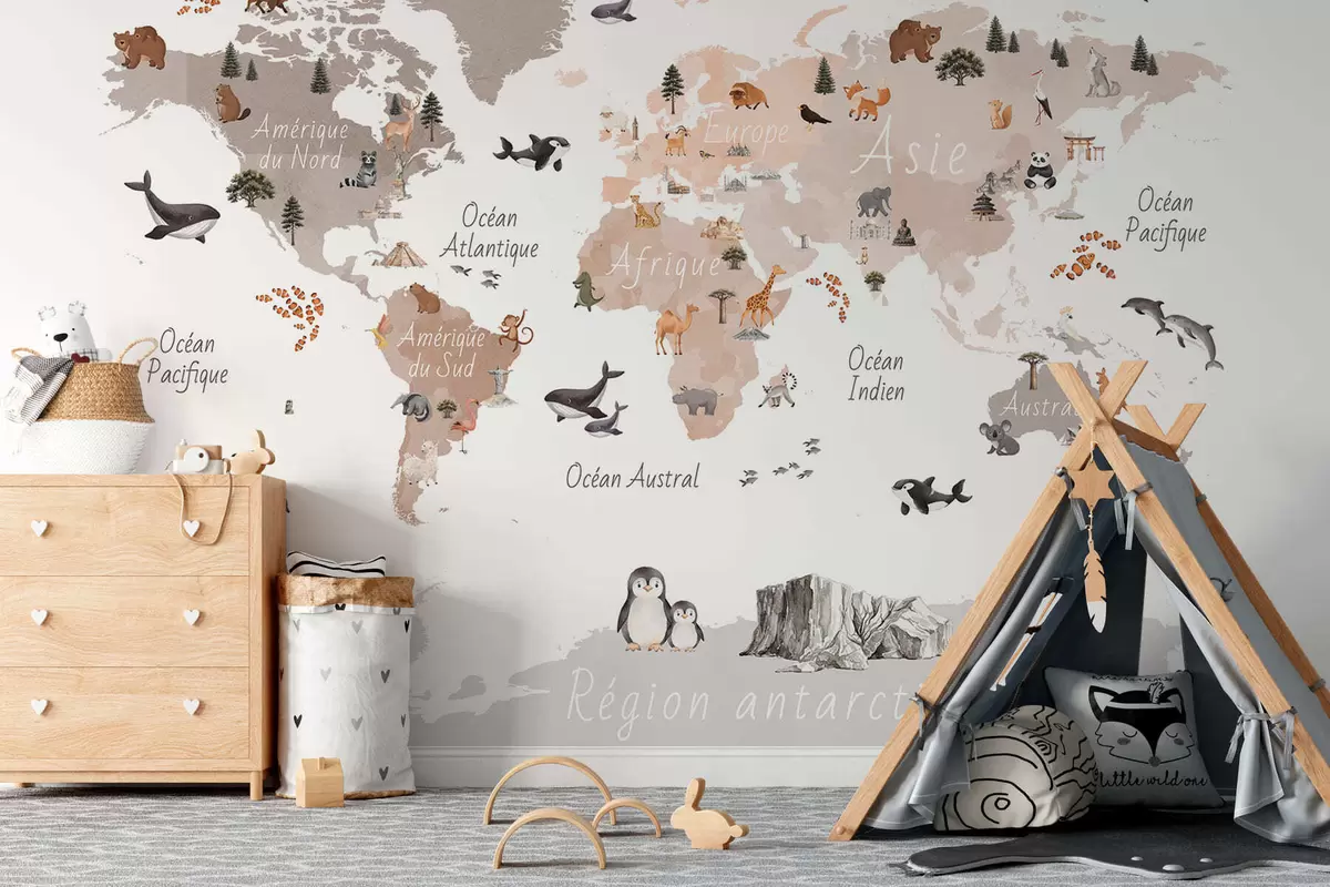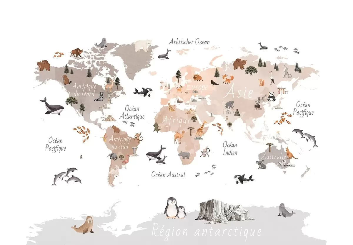 Фотошпалери Карта у стилі акварелі в бежевих тонах із зображеннями тварин, рослин та архітектурних споруд. Написи французькою мовою c00009frv3