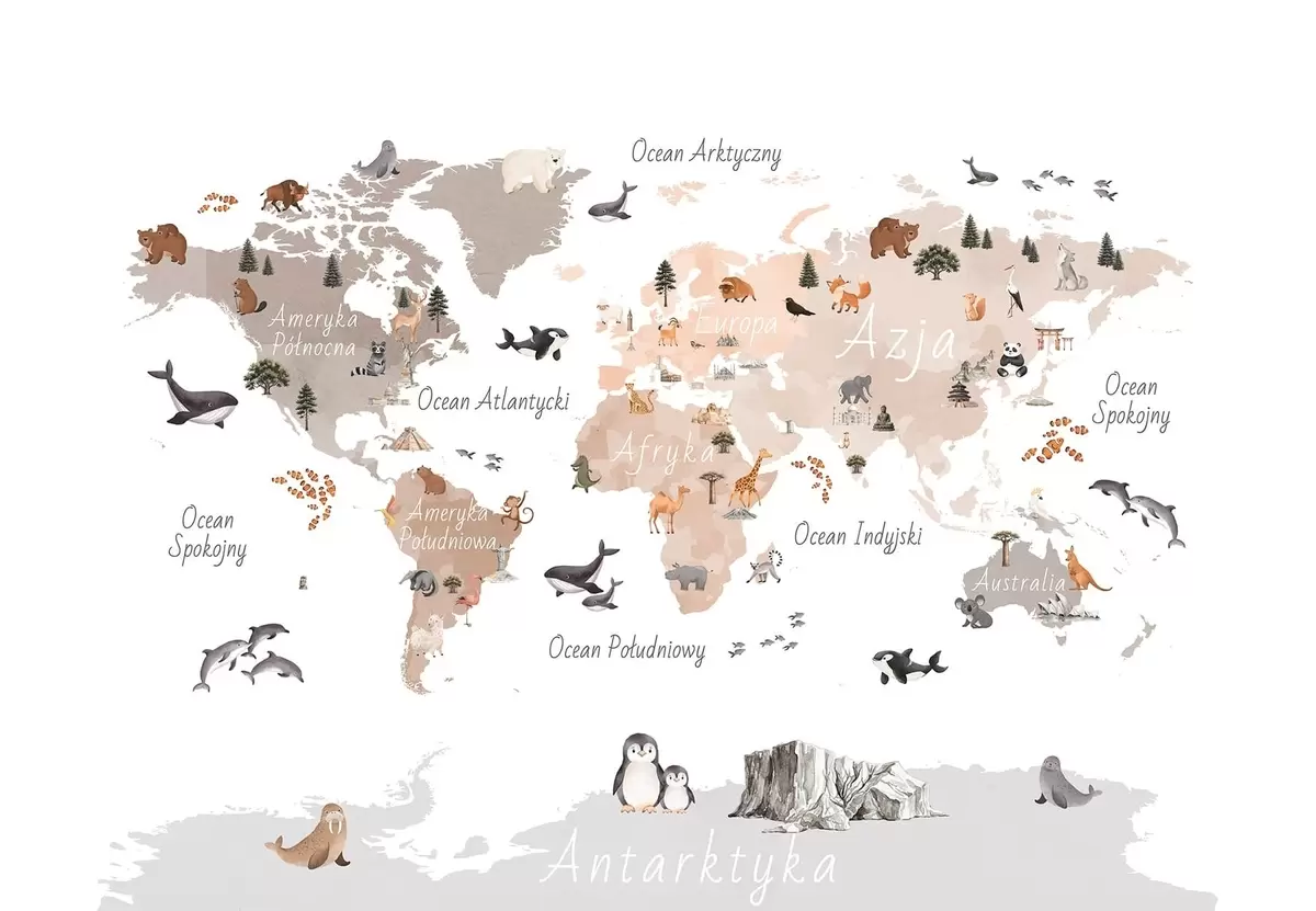 Фотошпалери Карта в бежевих тонах у стилі акварелі із зображеннями тварин, рослин та архітектурних споруд. Написи польською мовою c00009plv3