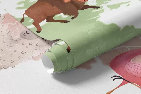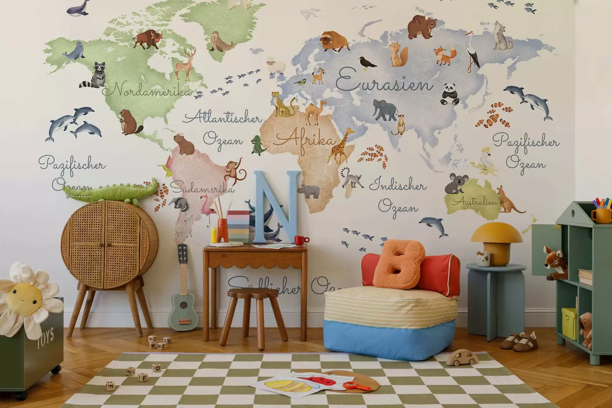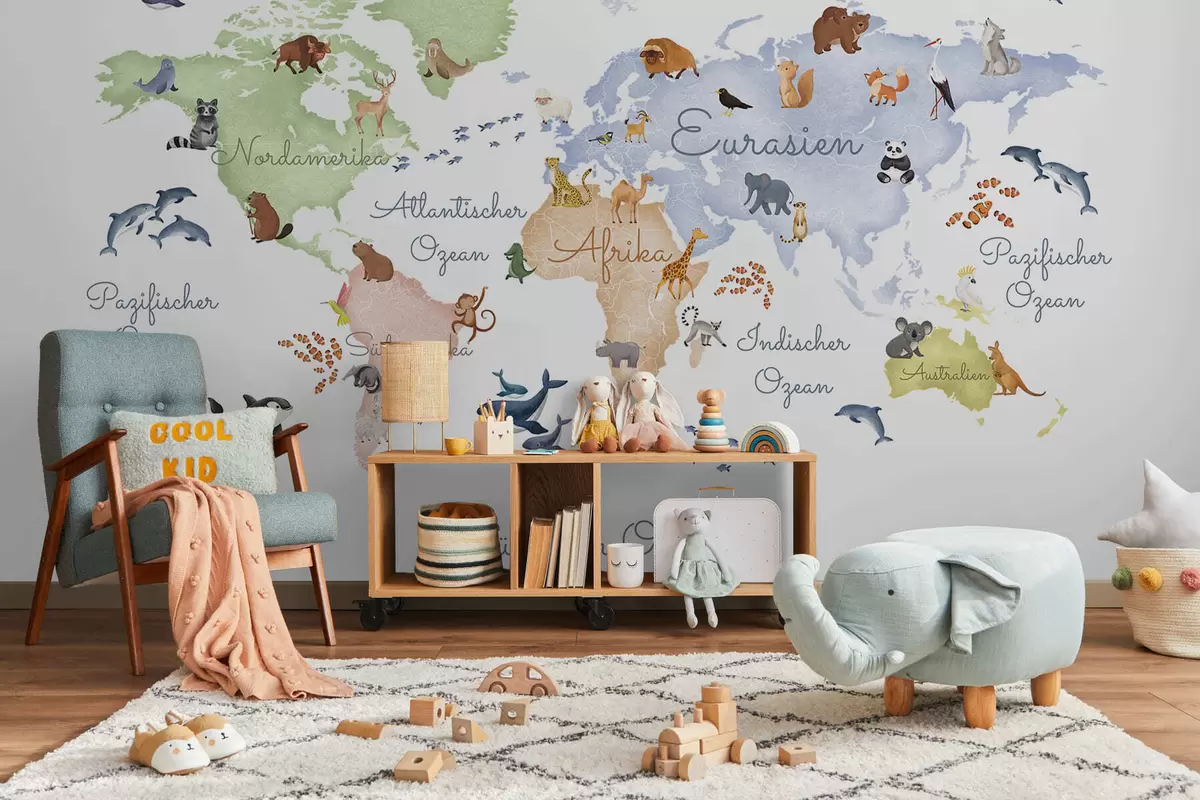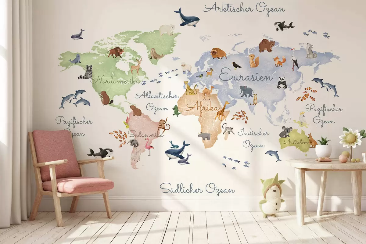Фотошпалери Карта у стилі акварелі з зображенням тварин. Написи німецькою мовою c00012de