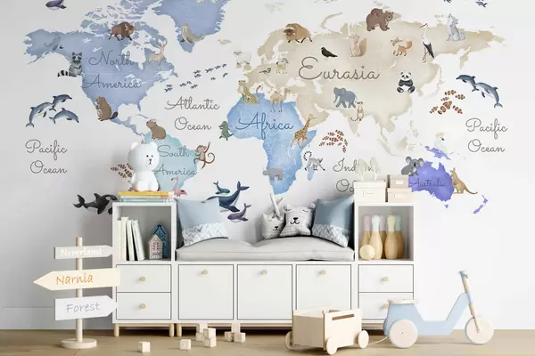 Фотошпалери Карта «Блакитна» у стилі акварелі із зображеннями тварин. Написи англійською мовою c00012env1