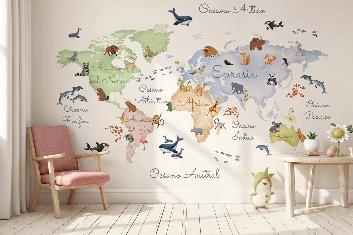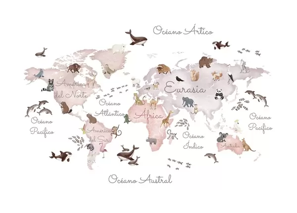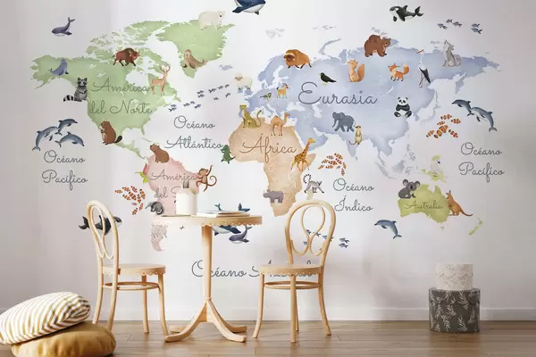 Фотошпалери Кольорова карта у стилі акварелі із зображенням тварин. Написи іспанською мовою c00012es