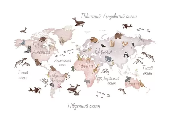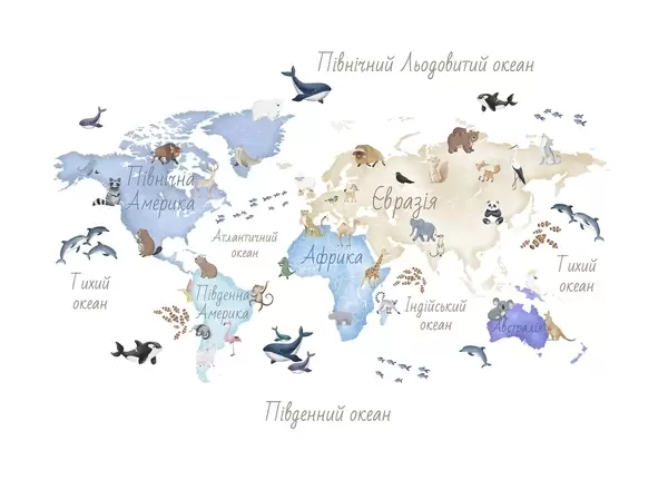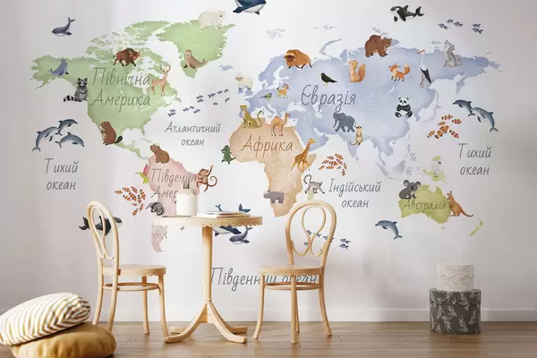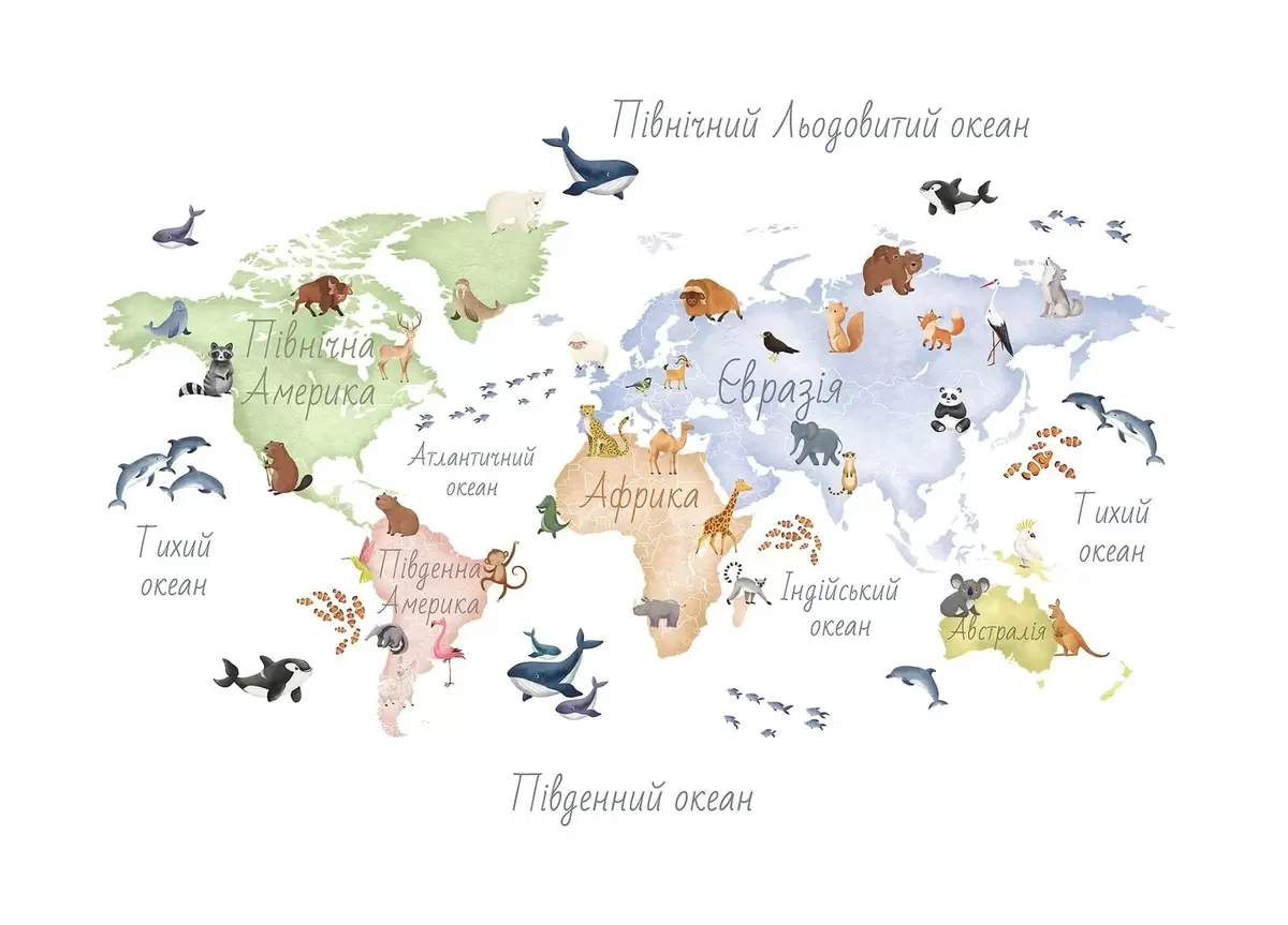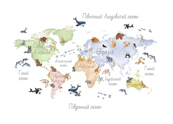 Фотошпалери Кольорова карта у стилі акварелі із зображеннями тварин. Написи українською мовою c00012uk