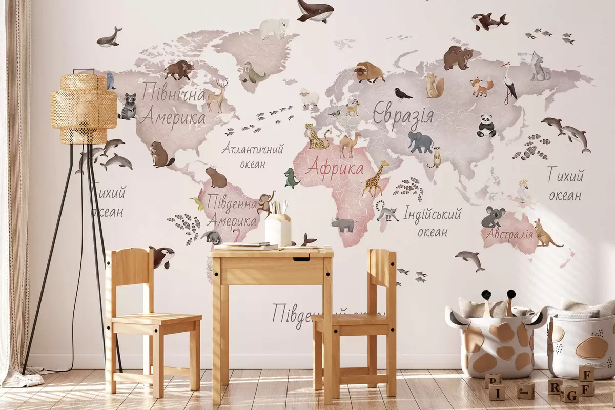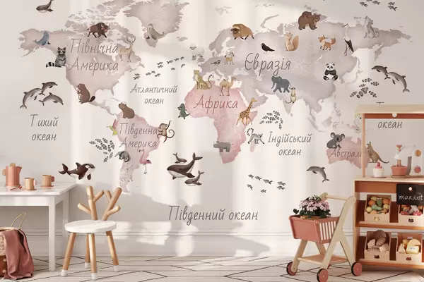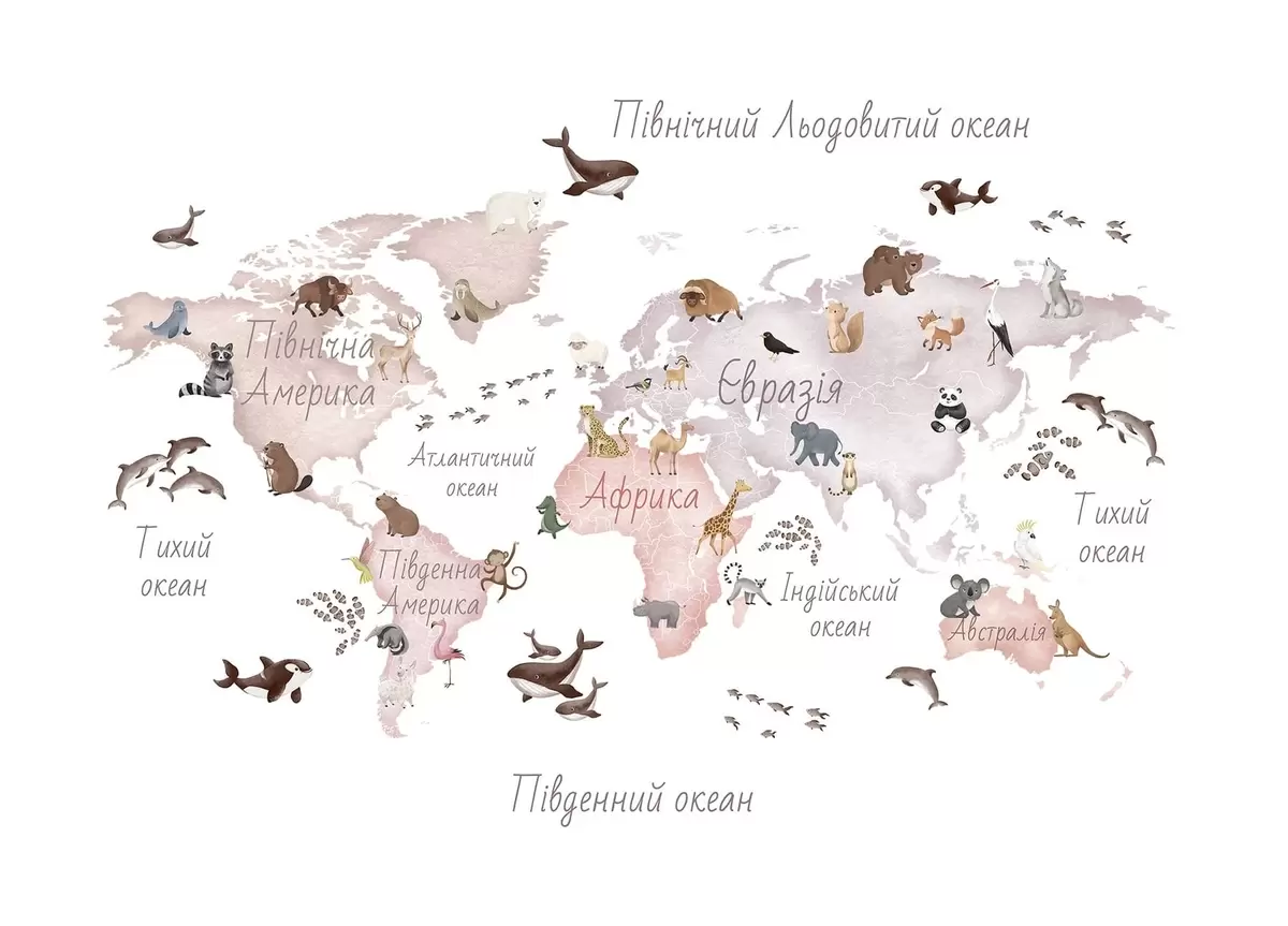 Фотошпалери Карта в бежевих тонах у стилі акварелі із зображенням тварин. Написи українською мовою c00012ukv3