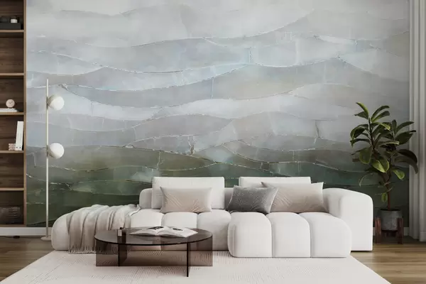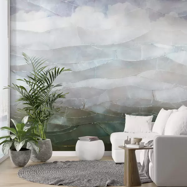 Фотошпалери Текстурований туманний, горбистий абстрактний градієнтний краєвид із рухомими зеленими полями крізь туман w00795