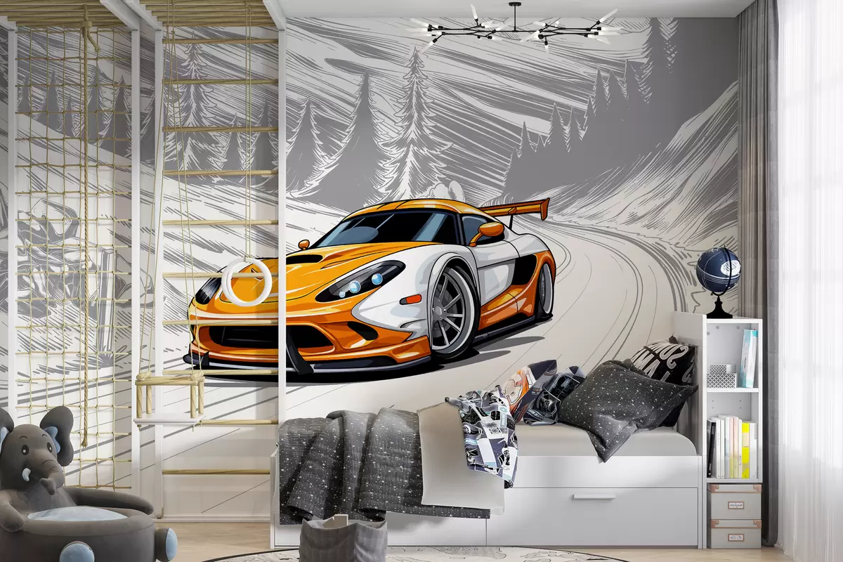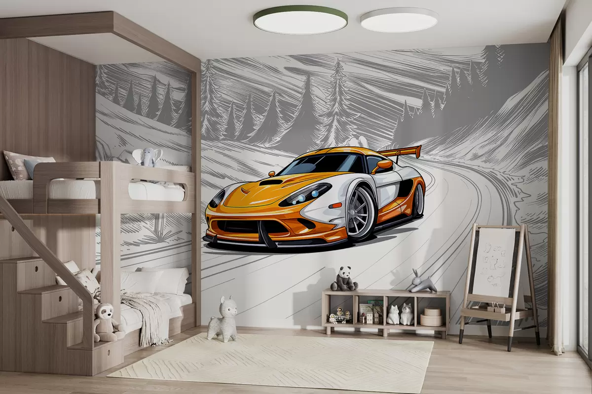 Фотошпалери Помаранчевий спортивний автомобіль на сірому фоні схематичної дороги серед гір і ялин. Для оформлення кімнати хлопчика w00954