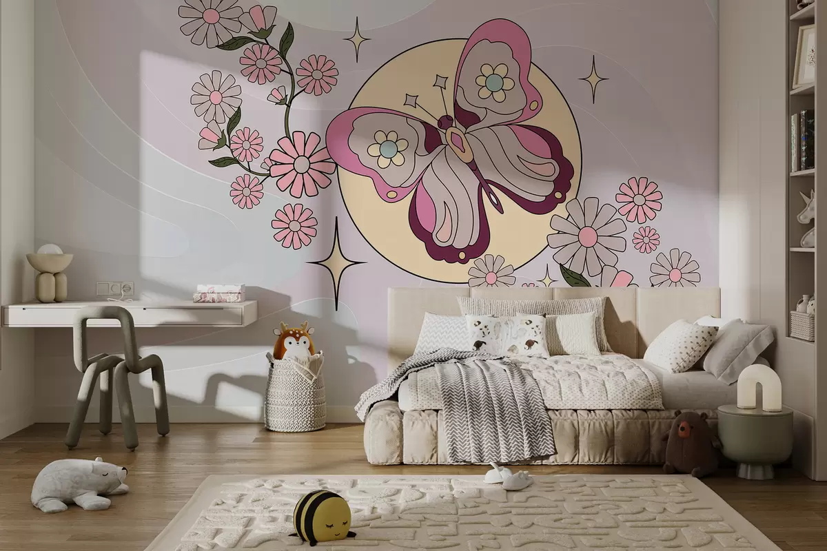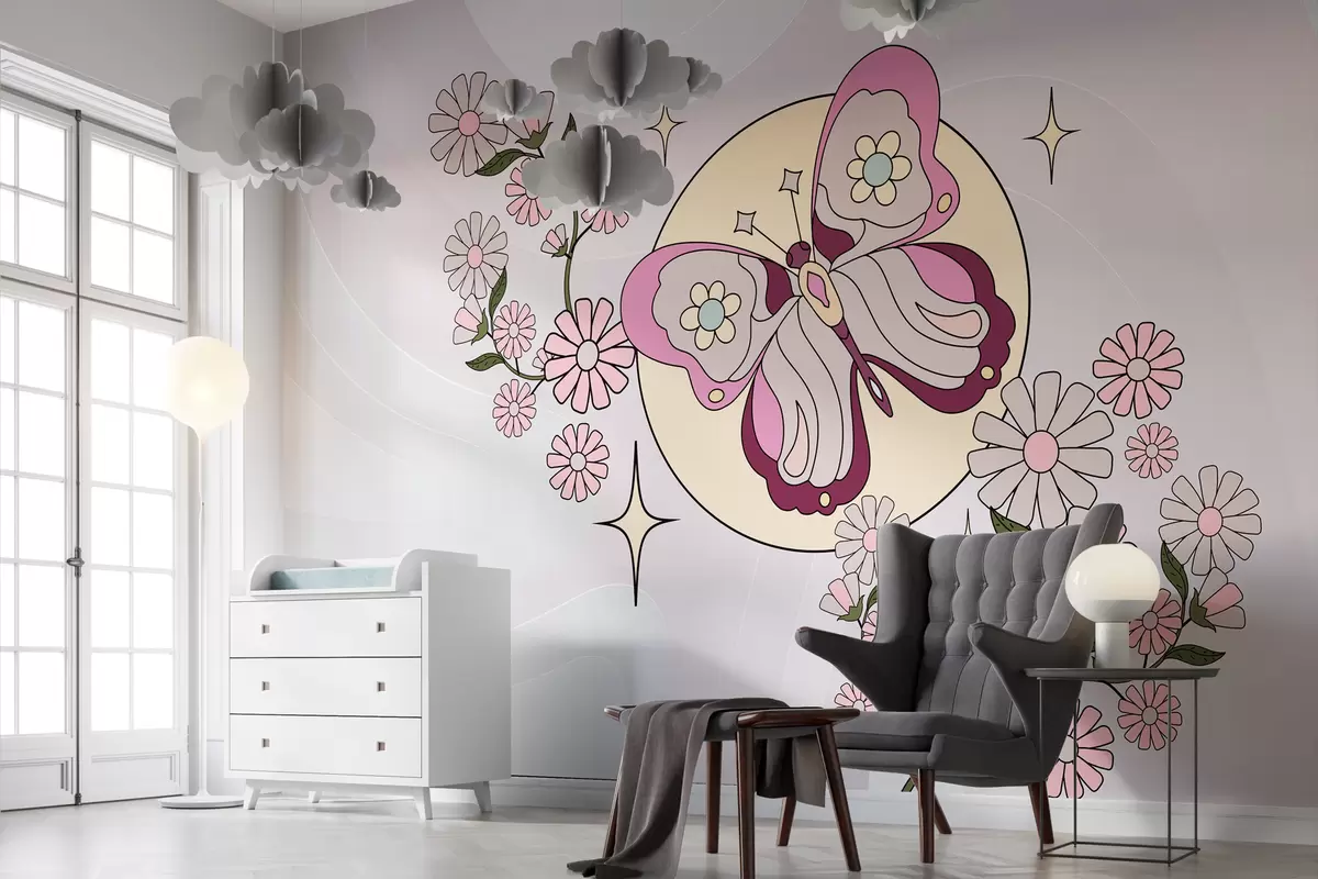 Фотошпалери шпалери з рожевим метеликом на світлому сіро-рожевому фоні серед квітів в простому стилі для кімнати дівчинки w00985