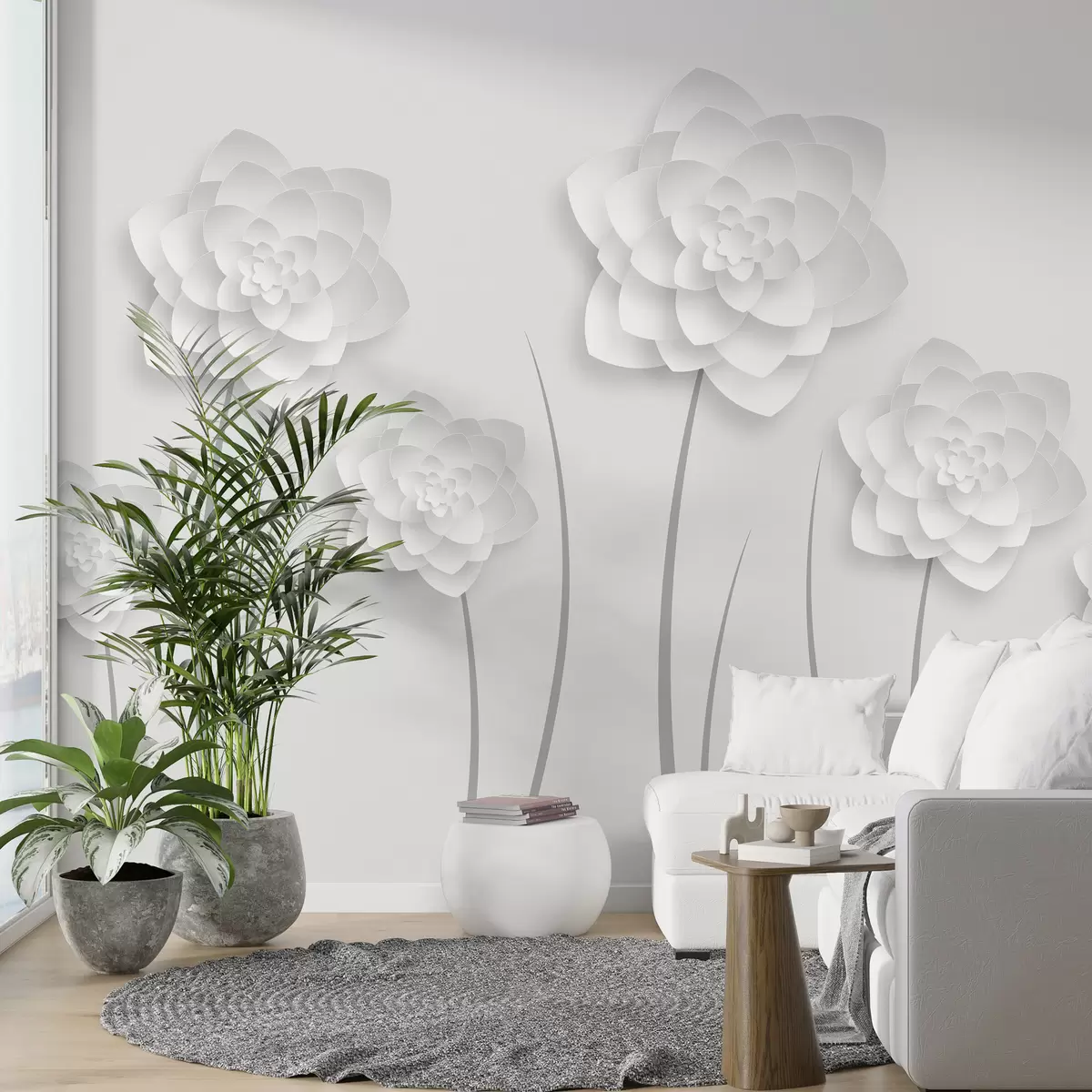 Фотошпалери Великі квіти з імітацією об'єму в паперовому стилі на світло-сірому фоні з сірою ніжкою w01021