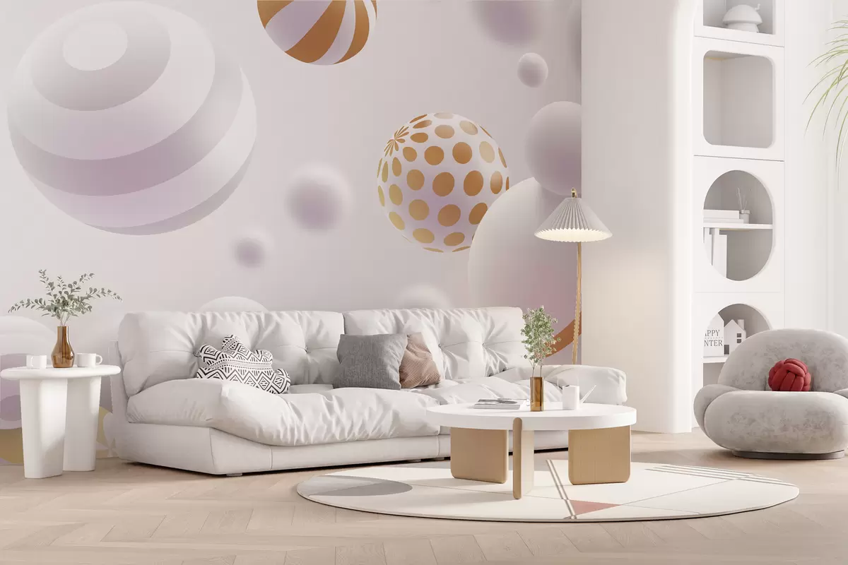 Фотошпалери Об'ємні летючі кулі в 3D-стилі у світло-сірих тонах з помаранчевими акцентами w01148