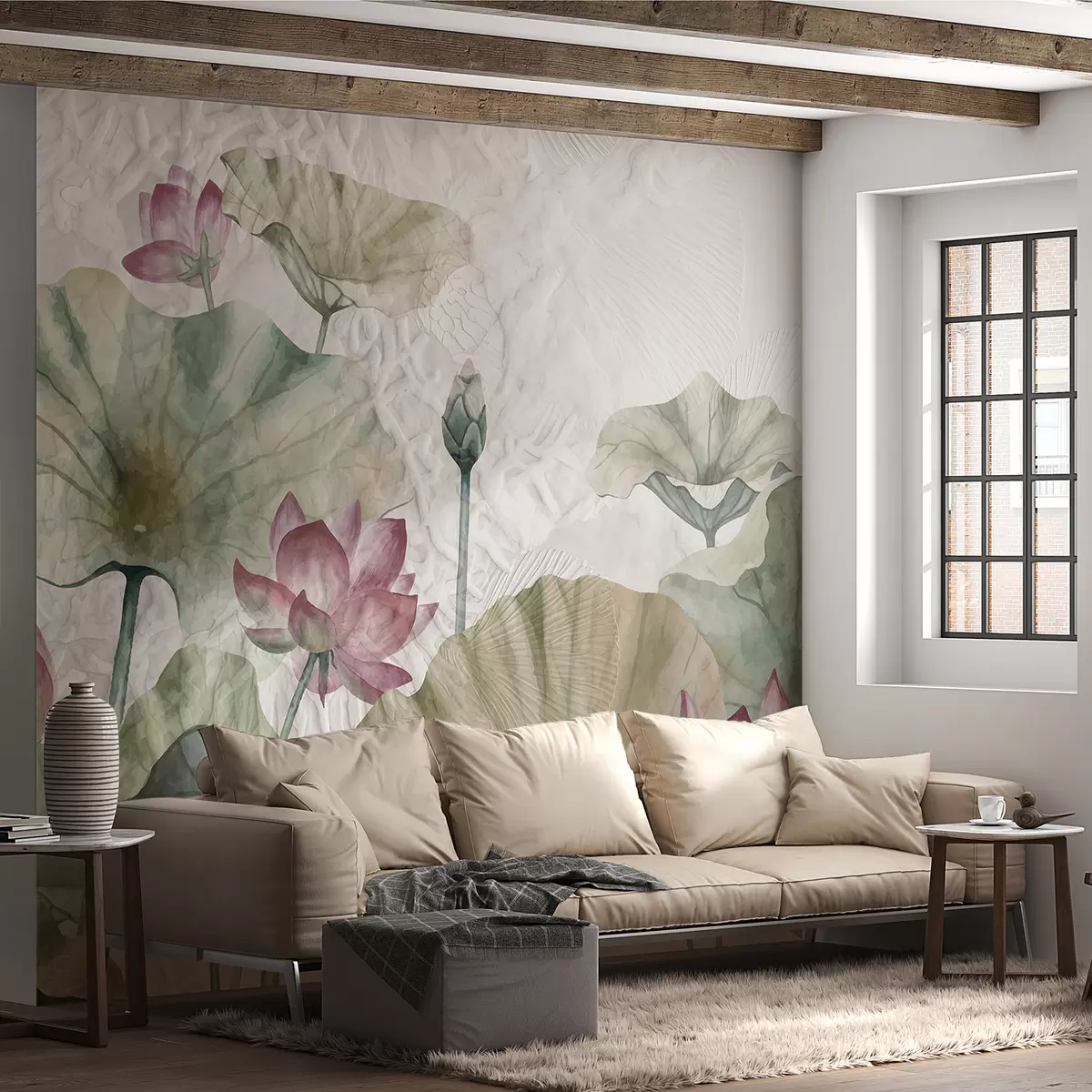 Шпалери Рожеві квіти лотоса із зеленим листям на світлому текстурованому фоні w01248