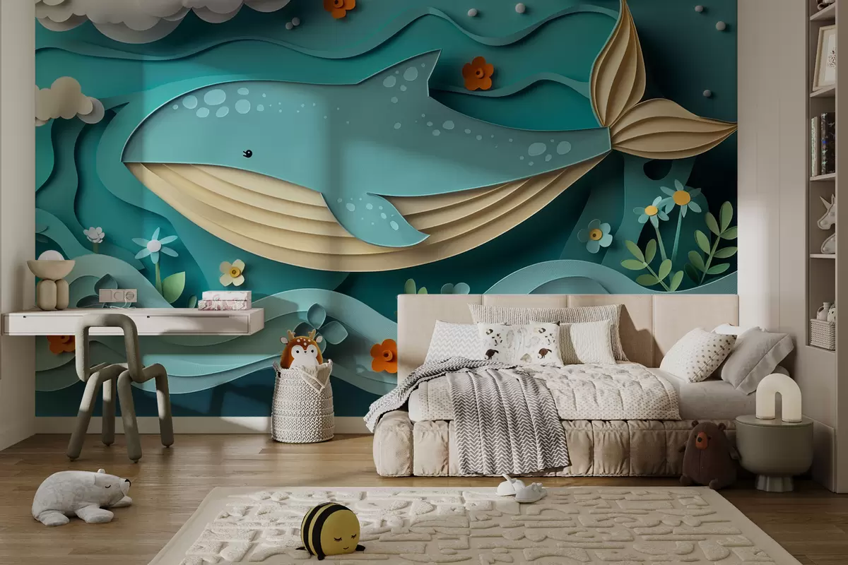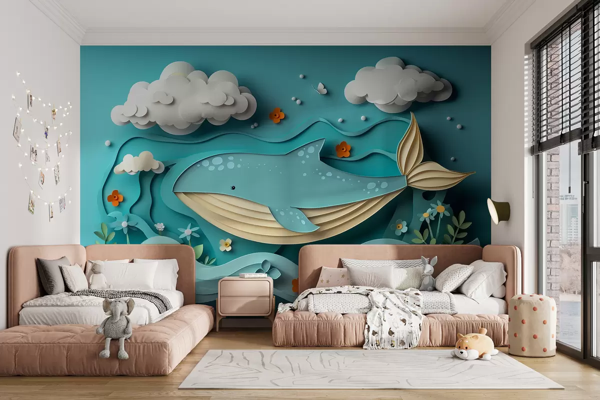 Фотошпалери Грайливий кит у хмарах у стилі паперової вирізки, 3D-ефект w01496