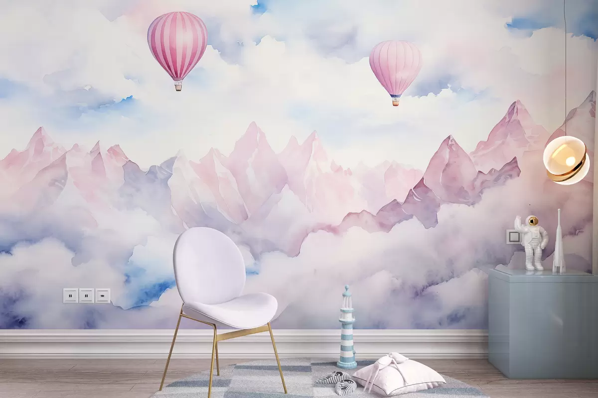 Фотошпалери Красивий гірський пейзаж з повітряними кулями, акварель w01792