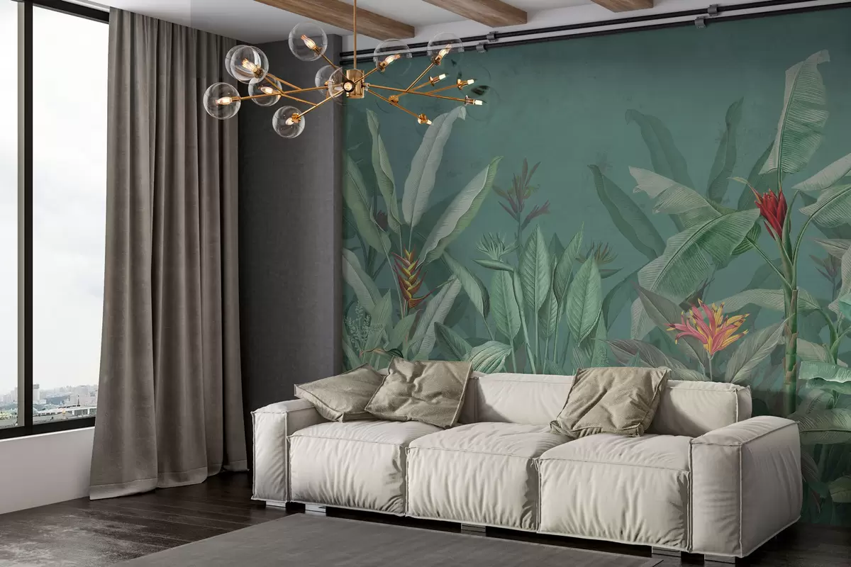 Фотошпалери Тропічне листя і квіти на зеленому тлі w01834v2