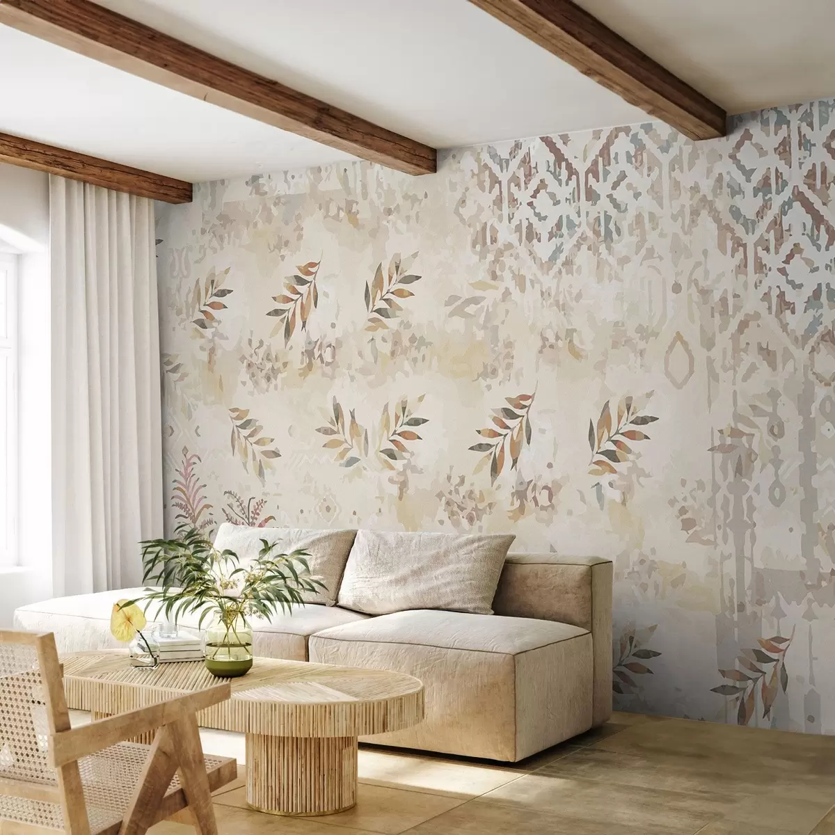 Фотошпалери шпалери в стилі ретро з візерунками, елементами потертості, плямами та листям, в бежевій кольоровій гамі w01955