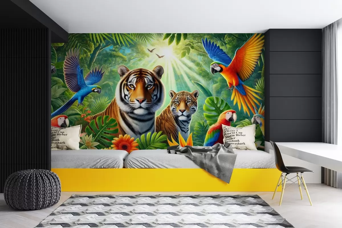 Фотошпалери Барвистий фотошпалери з панорамою тропіків з парою тигрів, папугами та квітами w02083