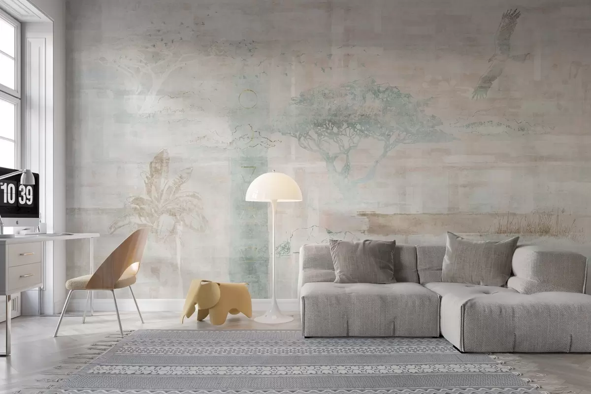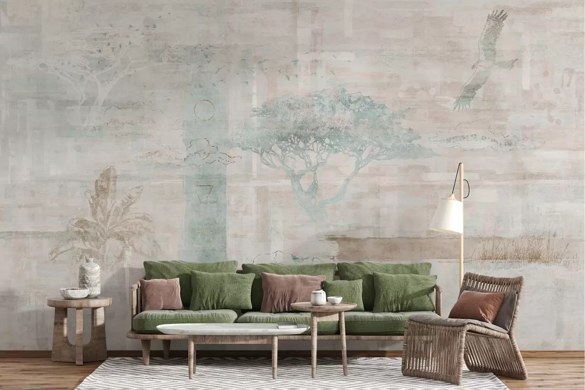 Фотошпалери Вінтажний дизайн з ефектом гранжу, деревами, орлом та геометричними елементами w02130