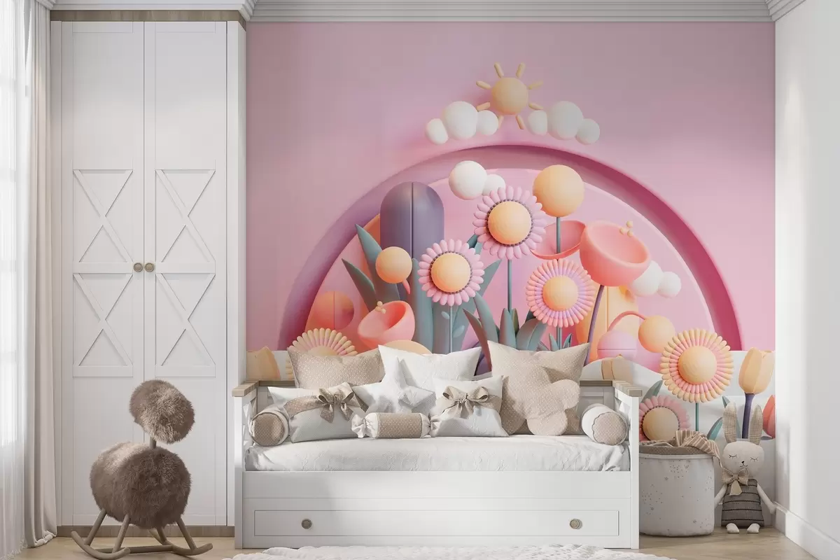 Фотошпалери Дитячі шпалери в 3D стилі з квітами та хмаринками в рожевих відтінках w02136