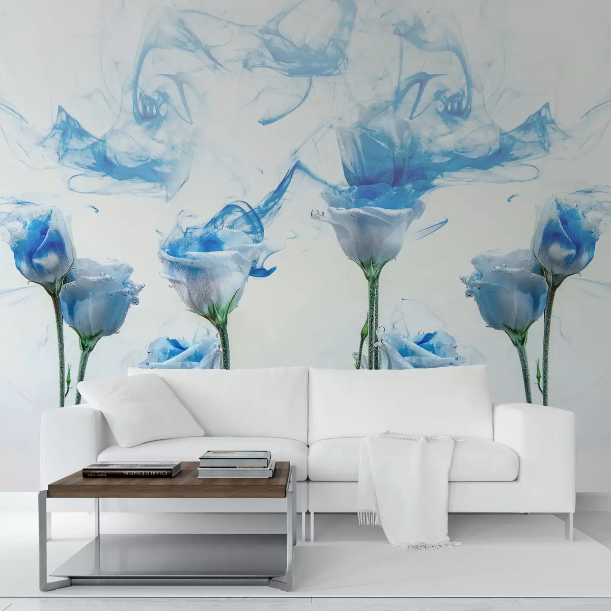 Фотошпалери Білі троянди під водою на білому тлі з синіми прожилками акрилової фарби. w02139