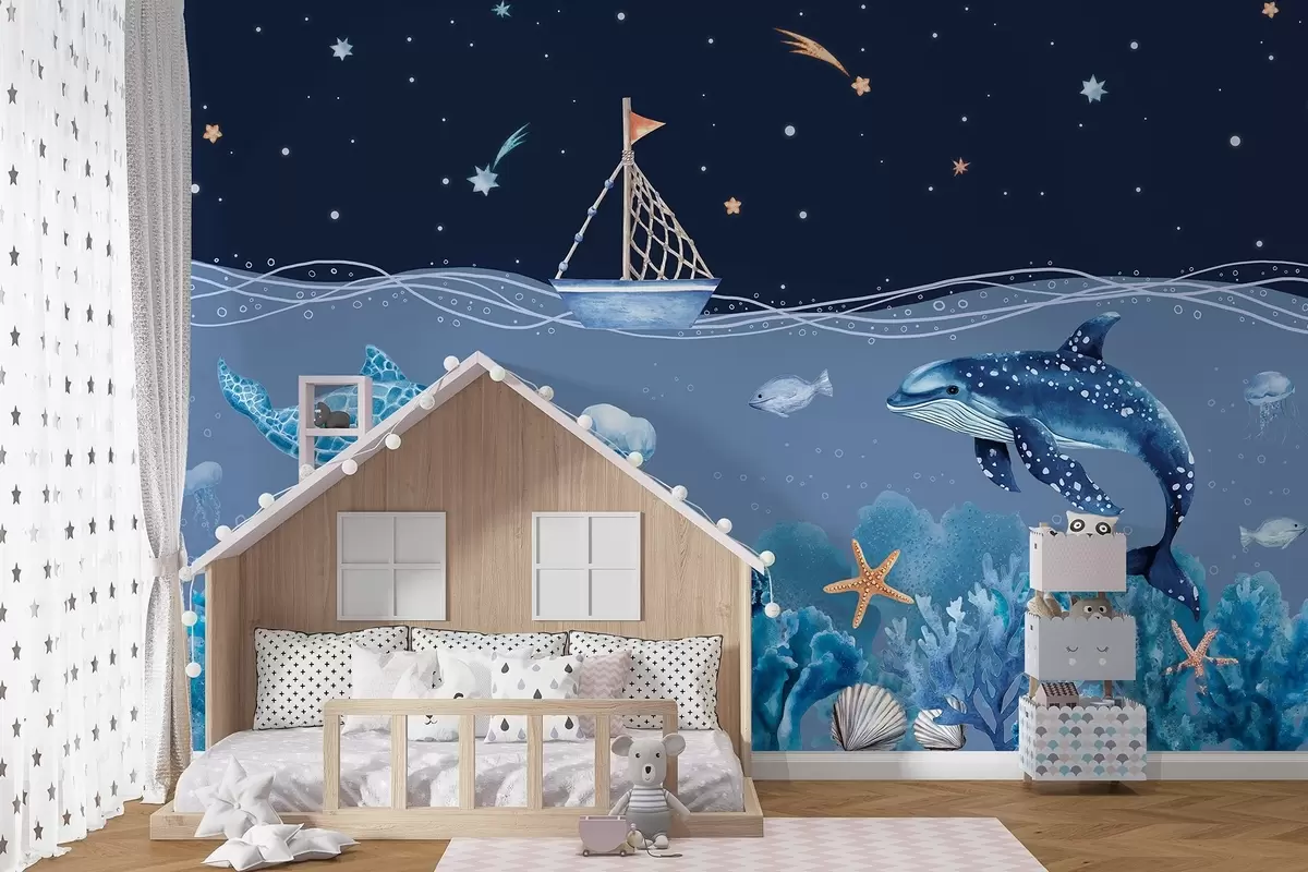 Фотошпалери Морське життя, акварельний стиль, корали, човен, дельфін, медуза, зоряне небо, блакитні кольори w02310