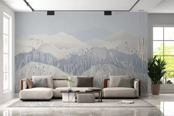 Фотошпалери Туманні гори, польові трави та квіти в блакитних тонах w02317v1