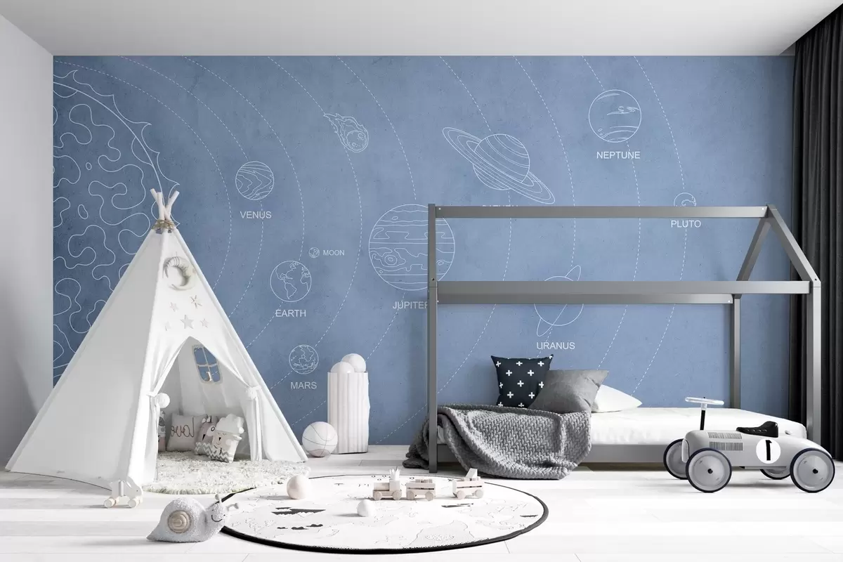 Фотошпалери Сонячна система в мінімалістичному стилі на синьому фактурному тлі w02344v1