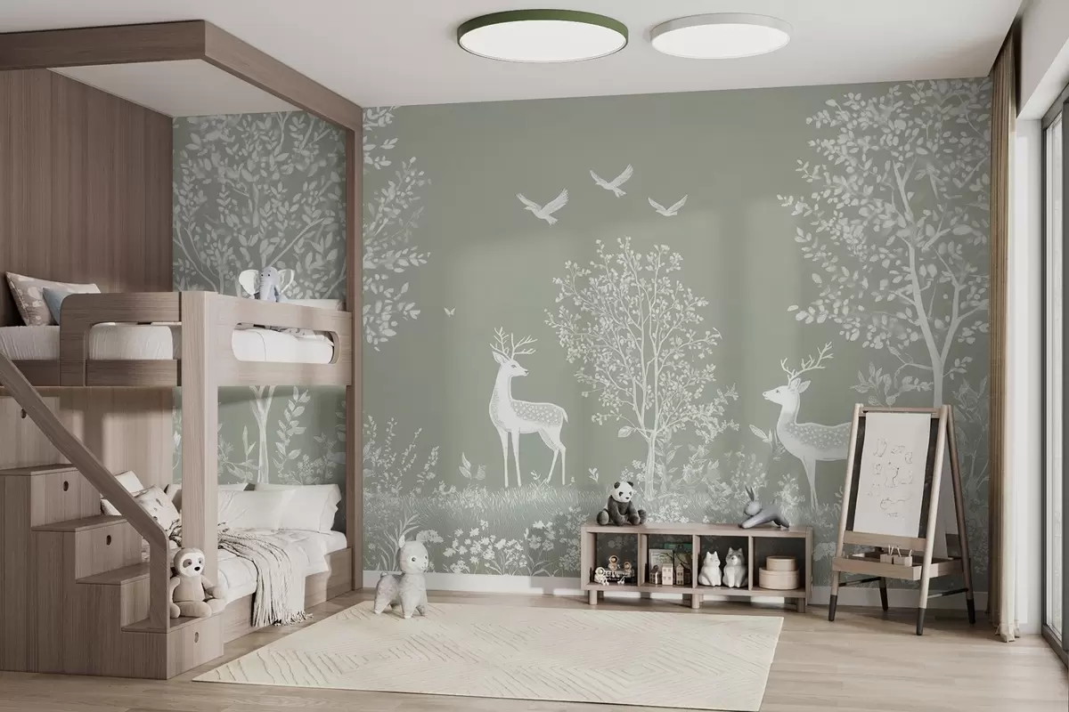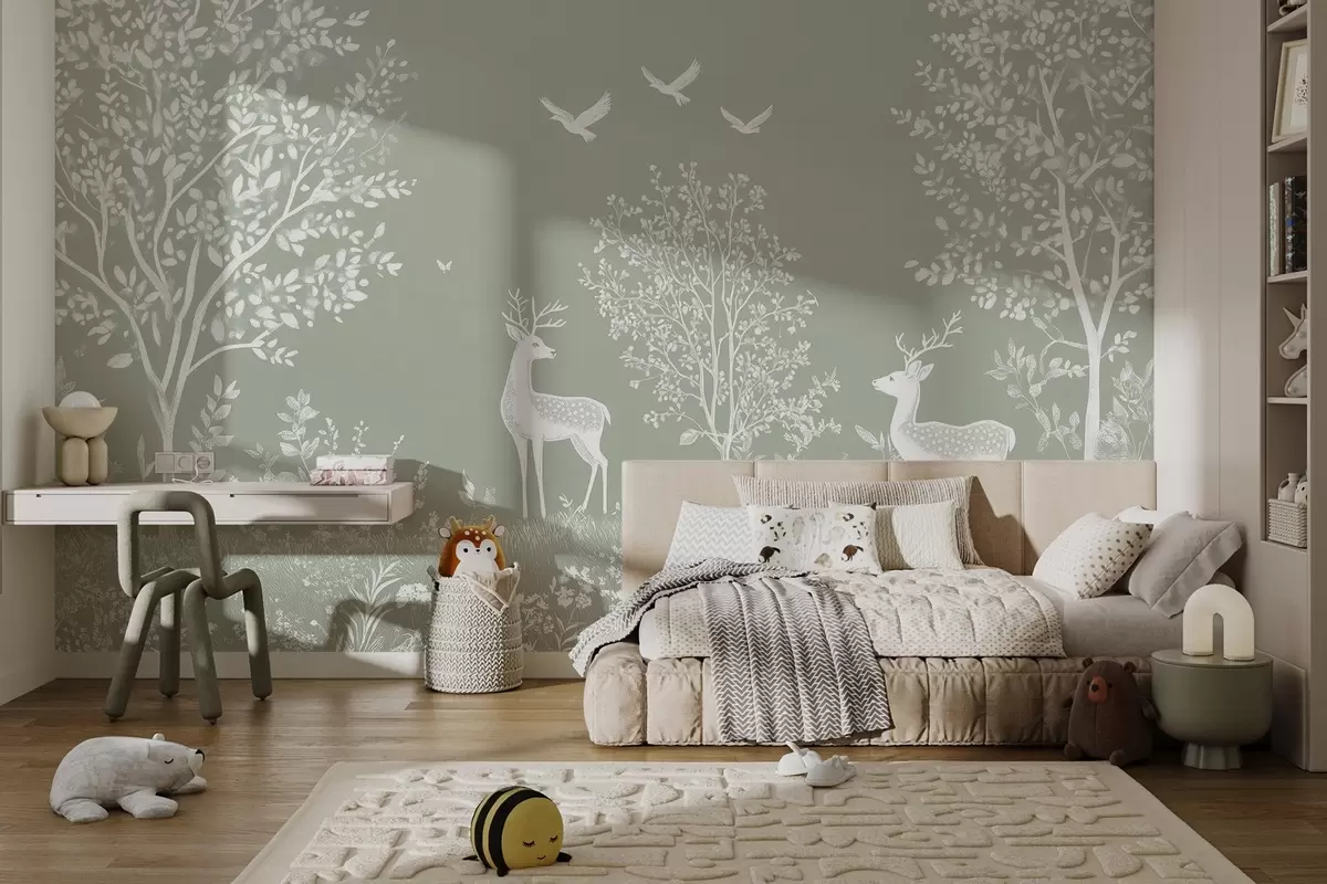 Фотошпалери ліс з оленями в стилі малюнка крейдою на оливковому тлі w02444v1