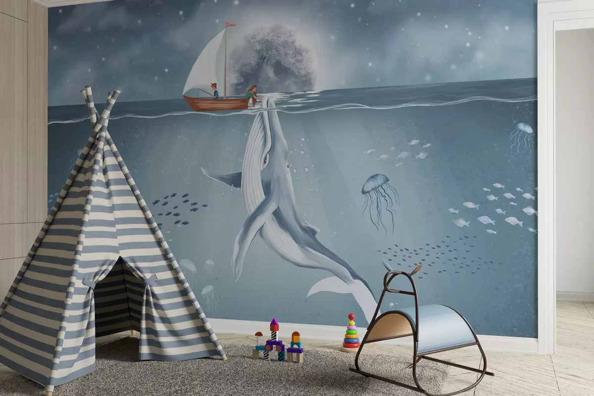 Фотошпалери Дитячий дизайн з китом, місяцем і човном з дітьми w02476