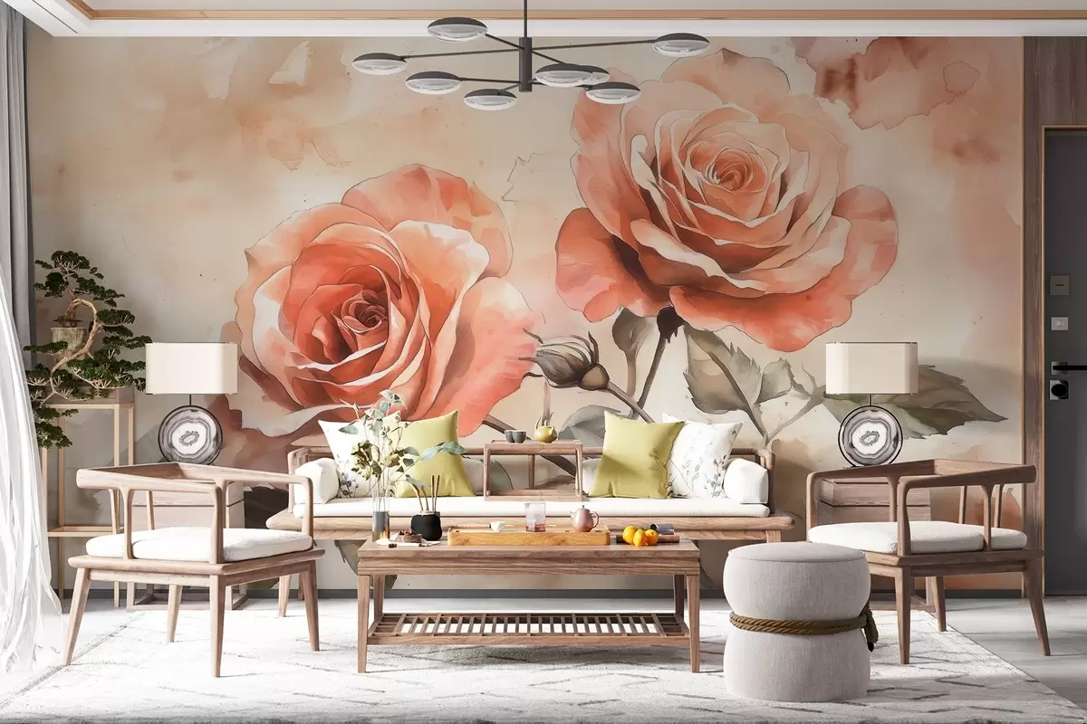 Фотошпалери Красиві червоні троянди в акварельному стилі, квіткові, бежеві кольори w02486