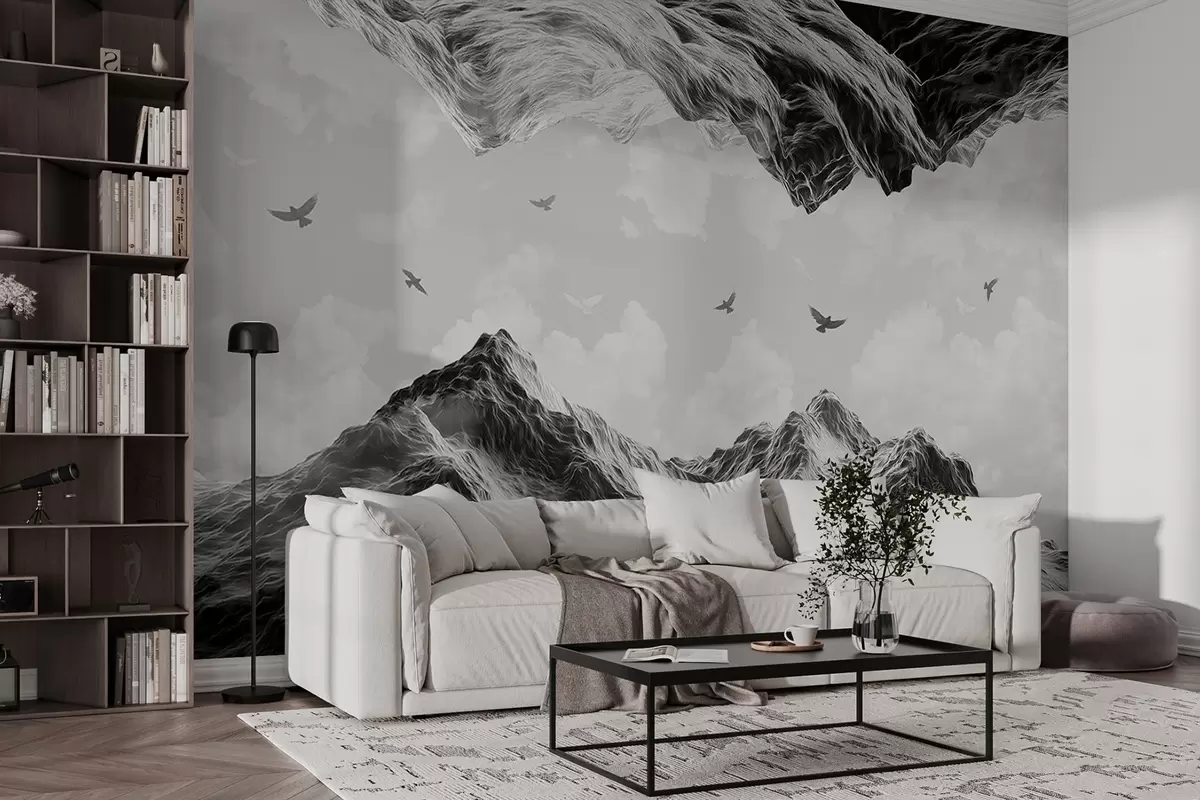 Фотошпалери Гірський пейзаж, реалізм, птахи, що летять, природа, хмари, чорно-білі кольори w02514